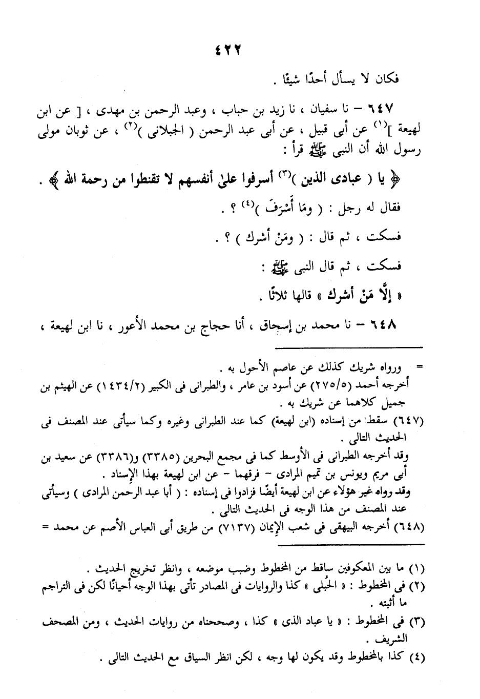 647 - نا سُفْيَانُ، نا زَيْدُ بْنُ حُبَابٍ، وَعَبْدُ الرَّحْمَنِ بْنُ مَهْدِيٍّ، عَنِ ابْنِ لَهِيعَةَ، عَنْ أَبِي قَبِيلٍ، عَنْ أَبِي عَبْدِ الرَّحْمَنِ الْجُبْلَانِيِّ، عَنْ ثَوْبَانَ مَوْلَى رَسُولِ اللَّهِ، أَنَّ النَّبِيَّ صَلَّى اللهُ عَلَيْهِ وَسَلَّمَ قَرَأَ {§يَا عِبَادِيَ الَّذِينَ أَسْرَفُوا عَلَى أَنْفُسِهِمْ لَا تَقْنَطُوا مِنْ رَحْمَةِ اللَّهِ} [الزمر: 53] فَقَالَ لَهُ رَجُلٌ: وَمَا أَسْرَفَ؟ فَسَكَتَ ثُمَّ قَالَ: " وَمَنْ أَشْرَكَ؟ فَسَكَتَ ثُمَّ قَالَ النَّبِيُّ صَلَّى اللهُ عَلَيْهِ وَسَلَّمَ: «إِلَّا مَنْ أَشْرَكَ» قَالَهَا ثَلَاثًا "