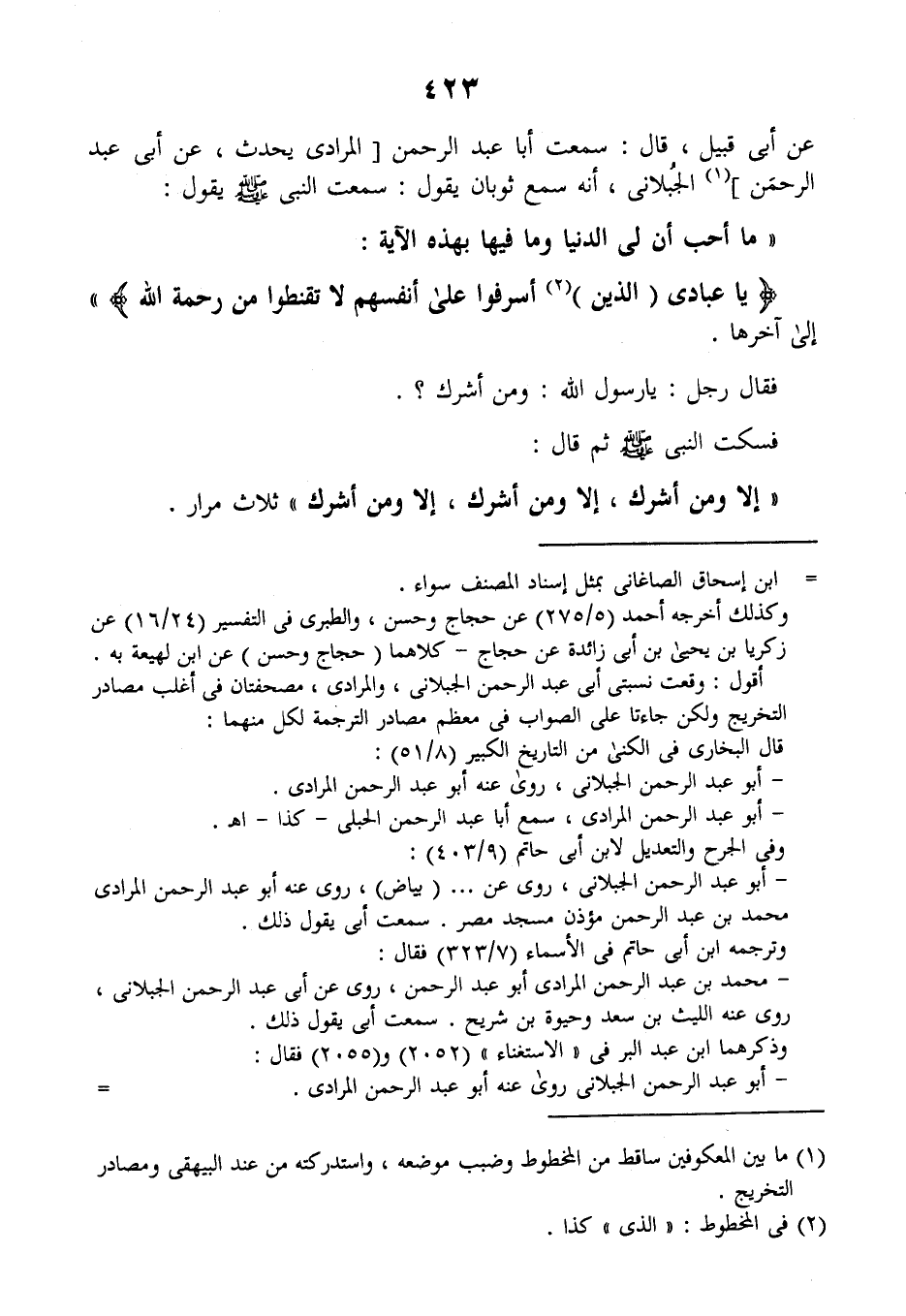 648 - نا مُحَمَّدُ بْنُ إِسْحَاقَ، أنا حَجَّاجُ بْنُ مُحَمَّدٍ الْأَعْوَرُ، نا ابْنُ لَهِيعَةَ، عَنْ أَبِي قَبِيلٍ، قَالَ: سَمِعْتُ أَبَا عَبْدِ الرَّحْمَنِ الْمُرَادِيَّ يُحَدِّثُ، عَنْ أَبِي عَبْدِ الرَّحْمَنِ الْجُبْلَانِيِّ أَنَّهُ سَمِعَ ثَوْبَانَ يَقُولُ: سَمِعْتُ النَّبِيَّ صَلَّى اللهُ عَلَيْهِ وَسَلَّمَ يَقُولُ: " مَا أُحِبُّ أَنْ لِيَ الدُّنْيَا وَمَا فِيهَا بِهَذِهِ الْآيَةِ {§يَا عِبَادِيَ الَّذِينَ أَسْرَفُوا عَلَى أَنْفُسِهِمْ لَا تَقْنَطُوا مِنْ رَحْمَةِ اللَّهِ} [الزمر: 53] " إِلَى آخِرِهَا، فَقَالَ رَجُلٌ: يَا رَسُولَ اللَّهِ، وَمَنْ أَشْرَكَ؟ فَسَكَتَ النَّبِيُّ صَلَّى اللهُ عَلَيْهِ وَسَلَّمَ ثُمَّ قَالَ: «إِلَّا وَمَنْ أَشْرَكَ، إِلَّا وَمَنْ أَشْرَكَ، إِلَّا وَمَنْ أَشْرَكَ» ثَلَاثَ مِرَارٍ -[424]- عَبْدُ الرَّحْمَنِ بْنُ يَزِيدَ، وَحَكِيمُ بْنُ عُمَيْرٍ