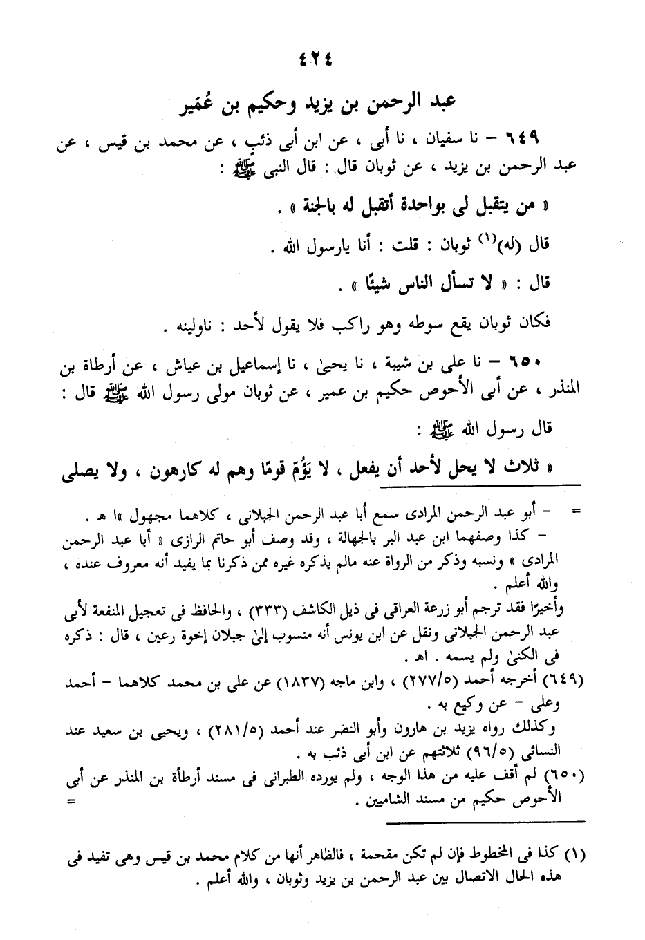 649 - نا سُفْيَانُ، نا أَبِي، عَنِ ابْنِ أَبِي ذِئْبٍ، عَنْ مُحَمَّدِ بْنِ قَيْسٍ، عَنْ عَبْدِ الرَّحْمَنِ بْنِ يَزِيدَ، عَنْ ثَوْبَانَ قَالَ: قَالَ النَّبِيُّ صَلَّى اللهُ عَلَيْهِ وَسَلَّمَ: «§مَنْ يَتَقَبَّلْ لِي بِوَاحِدَةٍ أَتَقَبَّلْ لَهُ بِالْجَنَّةِ» قَالَ لَهُ ثَوْبَانُ: قُلْتُ: أَنَا يَا رَسُولَ اللَّهِ، قَالَ: «لَا تَسْأَلِ النَّاسَ شَيْئًا» فَكَانَ ثَوْبَانُ يَقَعُ سَوْطُهُ وَهُوَ رَاكِبٌ فَلَا يَقُولُ لِأَحَدٍ: نَاوِلْنِيهِ "