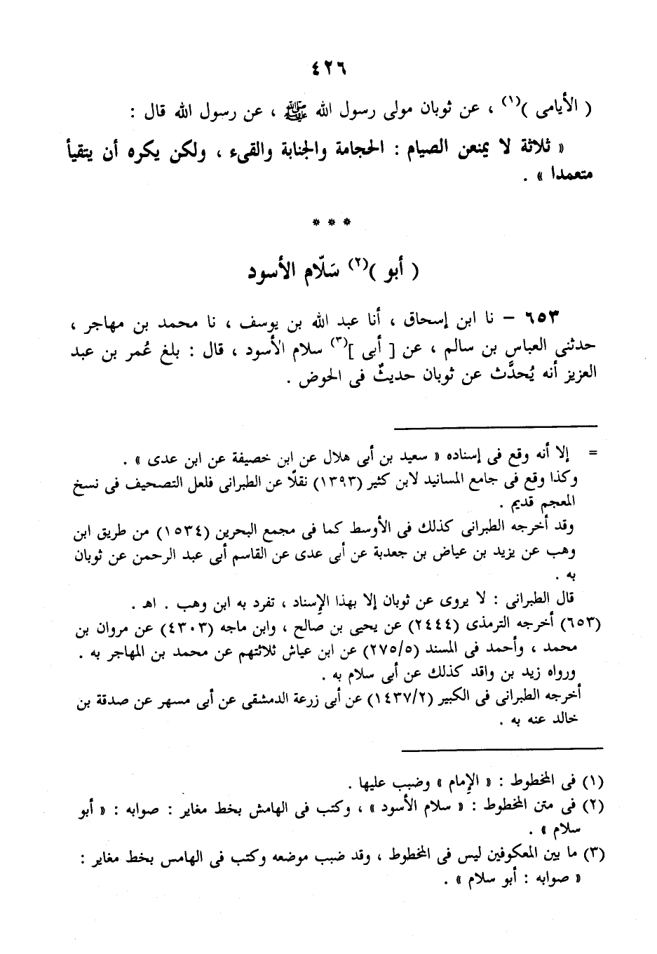 653 - نا ابْنُ إِسْحَاقَ، أنا عَبْدُ اللَّهِ بْنُ يُوسُفَ، نا مُحَمَّدُ بْنُ مُهَاجِرٍ، حَدَّثَنِي الْعَبَّاسُ بْنُ سَالِمٍ، عَنْ أَبِي سَلَّامٍ الْأَسْوَدِ قَالَ: بَلَغَ عُمَرَ بْنَ عَبْدِ الْعَزِيزِ أَنَّهُ يُحَدَّثُ عَنْ ثَوْبَانَ حَدِيثٌ فِي الْحَوْضِ -[427]-، قَالَ: أَحْبَبْتُ أَنْ تُشَافِهَنِي بِهِ مُشَافَهَةً، فَقَالَ أَبُو سَلَّامٍ: سَمِعْتُ ثَوْبَانَ يَقُولُ: قَالَ رَسُولُ اللَّهِ صَلَّى اللهُ عَلَيْهِ وَسَلَّمَ: «§حَوْضِي مَا بَيْنَ عَدَنَ إِلَى عُمَانَ، وَهُوَ أَشَدُّ بَيَاضًا مِنَ اللَّبَنِ، وَأَحْلَى مِنَ الْعَسَلِ، وَأَكْوَابُهُ بِهِ عَدَدُ نُجُومِ السَّمَاءِ، مَنْ شَرِبَ مِنْهُ شَرْبَةً لَمْ يَظْمَأْ بَعْدَهَا أَبَدًا، أَوَّلُ النَّاسِ وُرُودًا عَلَيْهِ فُقَرَاءُ الْمُهَاجِرِينَ، الشُّعْثُ رُءُوسًا، الدُّنْسُ ثِيَابًا، الَّذِينَ لَا يَنْكِحُونَ الْمُتَنَعِّمَاتِ، وَلَا يُفْتَحُ لَهُمُ السُّدَدُ» قَالَ: فَقَالَ عُمَرُ: لَكِنِّي قَدْ أُنْكِحْتُ الْمُتَنَعِّمَاتِ: فَاطِمَةَ بِنْتَ عَبْدِ الْمَلِكِ، وَفُتِحَتْ لِيَ السُّدَدُ، لَا جَرَمَ أَنِّي لَا أغْسِلُ رَأْسِي حَتَّى تَشْعَثَ، وَلَا ثَوْبِي الَّذِي يَلِي جَسَدِي حَتَّى يَتَّسِخَ "