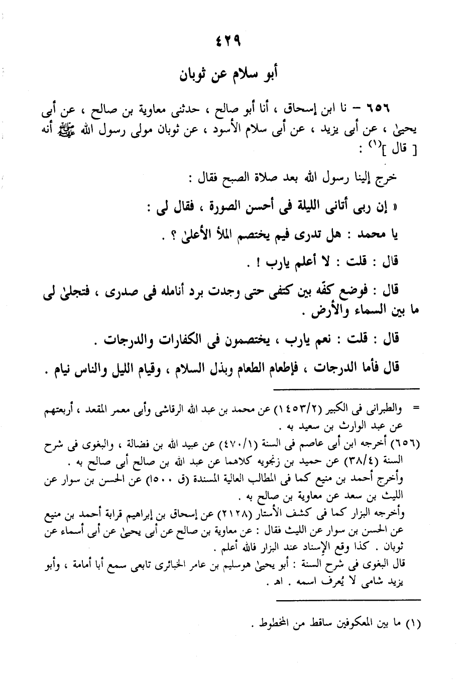 656 - نا ابْنُ إِسْحَاقَ، أَنَا أَبُو صَالِحٍ، حَدَّثَنِي مُعَاوِيَةُ بْنُ صَالِحٍ، عَنْ أَبِي يَحْيَى، عَنْ أَبِي يَزِيدَ، عَنْ أَبِي سَلَّامٍ الْأَسْودِ، عَنْ ثَوْبَانَ مَوْلَى رَسُولِ اللَّهِ صَلَّى اللهُ عَلَيْهِ وَسَلَّمَ أَنَّهُ قَالَ: خَرَجَ إِلَيْنَا رَسُولُ اللَّهِ بَعْدَ صَلَاةِ الصُّبْحِ فَقَالَ: " إنَّ §رَبِّي أَتَانِي اللَّيْلَةَ فِي أَحْسَنِ الصُّورَةِ فَقَالَ لِي: يَا مُحَمَّدُ، هَلْ تَدْرِي فِيمَ يَخْتَصِمُ الْمَلَأُ الْأَعْلَى؟ قَالَ: قُلْتُ: لَا أَعْلَمُ يَا رَبِّ، قَالَ: فَوَضَعَ كَفَّهُ بَيْنَ كَتِفَيَّ حَتَّى وَجَدْتُ بَرْدَ أَنَامِلِهِ فِي صَدْرِي، فَتَجَلَّى لِي مَا بَيْنَ السَّمَاءِ وَالْأَرْضِ، قَالَ: قُلْتُ: نَعَمْ يَا رَبِّ، يَخْتَصِمُونَ فِي الْكَفَّارَاتِ وَالدَّرَجَاتِ، قَالَ: فَأَمَّا الدَّرَجَاتُ فَإطْعَامُ الطَّعَامِ، وَبَذْلُ السَّلَامِ، وَقِيَامُ اللَّيْلِ وَالنَّاسُ نِيَامٌ -[430]-، وَأَمَّا الْكَفَّارَاتُ فَمَشْىٌ عَلَى الْأَقْدَامِ إِلَى الْجَمَاعَاتِ، وَإسْبَاغُ الْوُضُوءِ فِي الْكَرِيهَاتِ، وَجُلُوسٌ فِي الْمَسَاجِدِ خَلْفَ الصَّلَوَاتِ، قَالَ: ثُمَّ قَالَ لِي: يَا مُحَمَّدُ، قُلْ يُسْمَعْ، وَسَلْ تُعْطَ، قَالَ: اللَّهُمَّ إِنِّي أَسْأَلُكَ فَعْلَ الْخَيْرَاتِ، وَتَرْكَ الْمُنْكَرَاتِ، وَحُبَّ الْمَسَاكِينِ، وَأَنْ تَغْفِرَ لِي وَتَرْحَمَنِي، وَإذا أَرَدْتَ فِتْنَةً فِي قَوْمٍ فَتَوَفَّنِي إِلَيْكَ وَأَنَا غَيْرُ مَفْتُونٍ، اللَّهُمَّ إِنِّي أَسْأَلُكَ حُبَّكَ، وَحُبَّ مَنْ يُحِبُّكَ، وَحُبًّا يُبَلِّغُنِي حُبَّكَ "