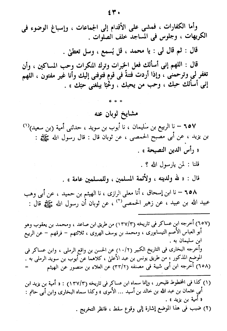 657 - نا الرَّبِيعُ بْنُ سُلَيْمَانَ نا أَيُّوبُ بْنُ سُوَيْدٍ، حَدَّثَنِي أُمَيَّةُ بْنُ سَعِيدِ بْنِ يَزِيدَ، عَنْ أَبِي مُصَبَّحٍ الْحِمْصِيِّ، عَنْ ثَوْبَانَ قَالَ: قَالَ رَسُولُ اللَّهِ صَلَّى اللهُ عَلَيْهِ وَسَلَّمَ: «§رَأْسُ الدِّينِ النَّصِيحَةُ» قُلْنَا: لِمَنْ يَا رَسُولَ اللَّهِ؟ قَالَ: «للَّهِ وَلِدِينِهِ وَلِأَئِمَّةِ الْمُسْلِمِينَ، وَلِلْمُسْلِمِينَ عَامَّةً»