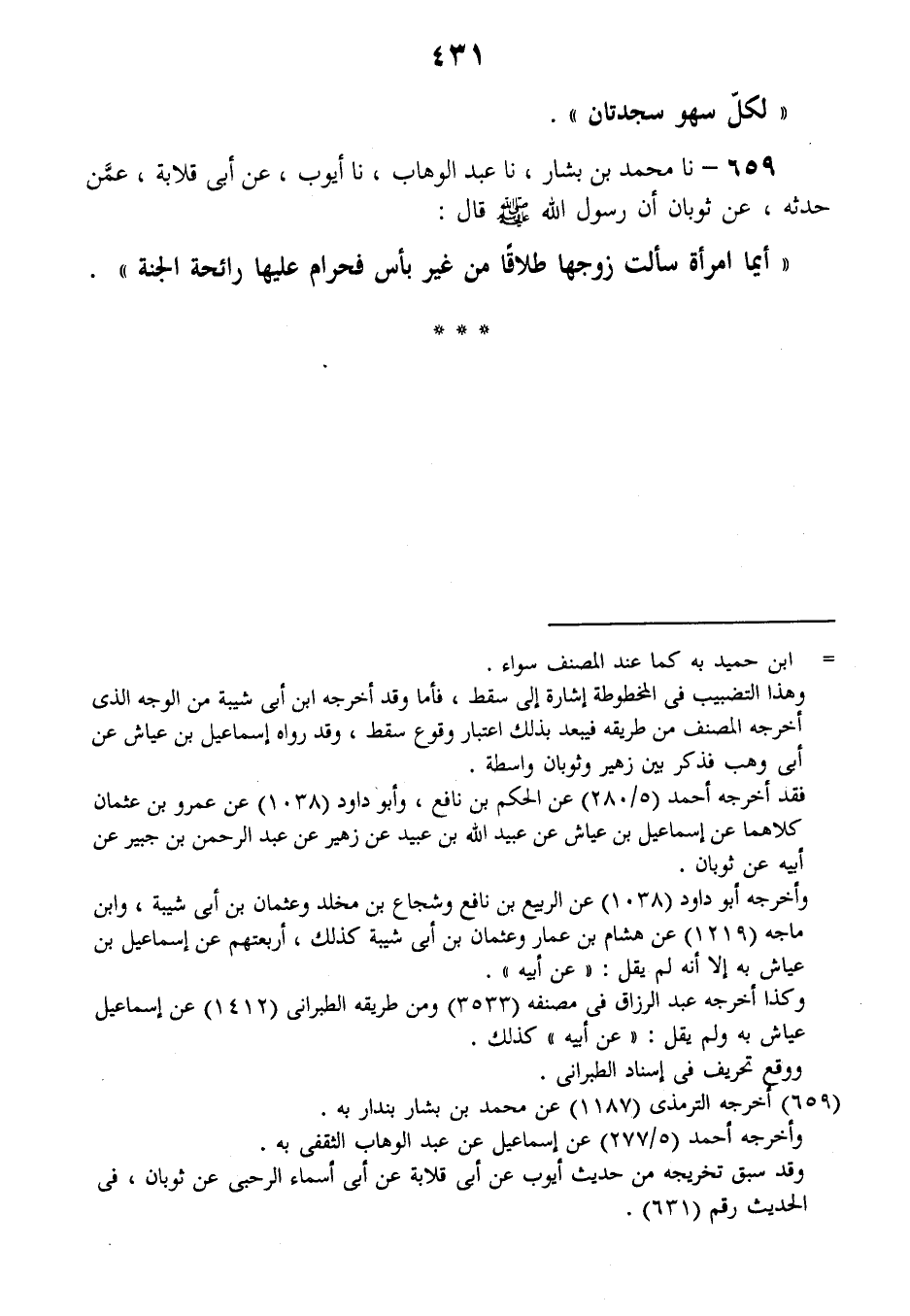 659 - نا مُحَمَّدُ بْنُ بَشَّارٍ، نا عَبْدُ الْوَهَّابِ، نا أَيُّوبُ، عَنْ أَبِي قِلَابَةَ عَمَّنْ حَدَّثَهُ، عَنْ ثَوْبَانَ، أَنَّ رَسُولَ اللَّهِ صَلَّى اللهُ عَلَيْهِ وَسَلَّمَ قَالَ: «§أَيُّمَا امْرَأَةٍ سَأَلَتْ زَوْجَهَا طَلَاقًا مِنْ غَيْرِ بَأْسٍ فَحَرَامٌ عَلَيْهَا رَائِحَةُ الْجَنَّةِ»