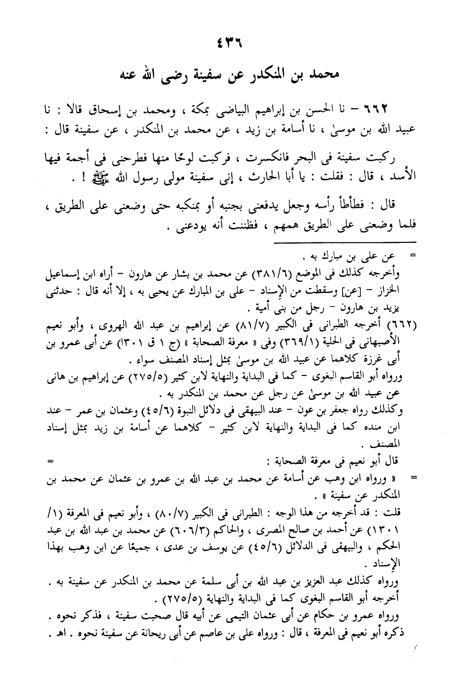 662 - نا الْحَسَنُ بْنُ إِبْرَاهِيمَ الْبَيَاضِيُّ بِمَكَّةَ، وَمُحَمَّدُ بْنُ إِسْحَاقَ قَالَا: نا عُبَيْدُ اللَّهِ بْنُ مُوسَى، نا أُسَامَةُ بْنُ زَيْدٍ، عَنْ مُحَمَّدِ بْنِ الْمُنْكَدِرِ، عَنْ سَفِينَةَ قَالَ: " §رَكِبْتُ سَفِينَةً فِي الْبَحْرِ فَانْكَسَرَتْ، فَرَكِبْتُ لَوْحًا مِنْهَا فَطَرَحَنِي فِي أَجَمَةٍ فِيهَا الْأَسَدُ، قَالَ: فَقُلْتُ: يَا أَبَا الْحَارِثِ، إِنِّي سَفِينَةُ مَوْلَى رَسُولِ اللَّهِ صَلَّى اللهُ عَلَيْهِ وَسَلَّمَ، قَالَ: فَطَأْطَأَ رَأْسَهُ وَجَعَلَ يَدْفَعُنِي بِجَنْبِهِ أَوْ بِمَنْكِبِهِ حَتَّى وَضَعَنِي عَلَى الطَّرِيقِ، فَلَمَّا وَضَعَنِي عَلَى الطَّرِيقِ هَمْهَمَ فَظَنَنْتُ أَنَّهُ يُوَدِّعُنِي "
