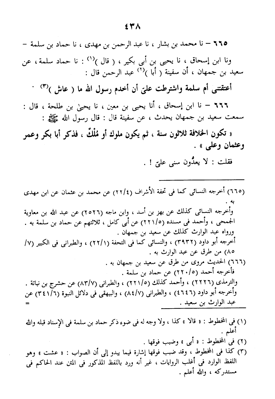 666 - نا ابْنُ إِسْحَاقَ، أنا يَحْيَى بْنُ مَعِينٍ، نا يَحْيَى بْنُ طَلْحَةَ قَالَ: سَمِعْتُ سَعِيدَ بْنَ جُمْهَانَ يُحَدِّثُ، عَنْ سَفِينَةَ، قَالَ: قَالَ رَسُولُ اللَّهِ صَلَّى اللهُ عَلَيْهِ وَسَلَّمَ: «§تَكُونُ الْخِلَافَةُ ثَلَاثِينَ سَنَةً، ثُمَّ يَكُونُ مُلُوكٌ - أَوْ مُلْكٌ - فَذَكَرَ أَبَا بَكْرٍ، وَعُمَرَ، وَعُثْمَانَ، وَعَلِيًّا» فَقُلْتُ: لَا يَعُدُّونَ سِنِيَّ عَلِيٍّ، فَقَالَ: كَذَبَتْ أَسْتَاهُ بَنِي الزَّرْقَاءِ