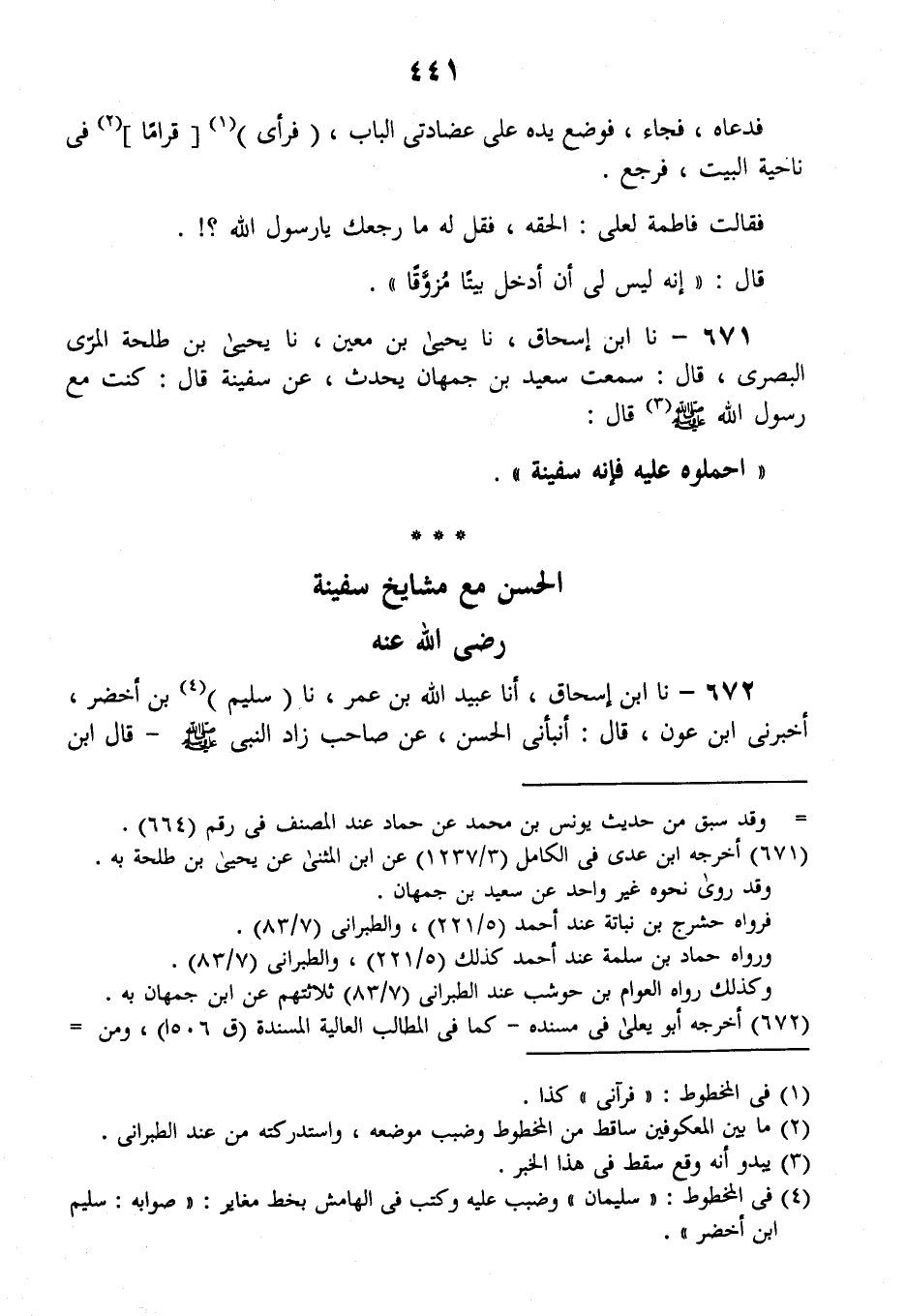 671 - نا ابْنُ إِسْحَاقَ، نا يَحْيَى بْنُ مَعِينٍ، نا يَحْيَى بْنُ طَلْحَةَ الْمُرِّيُّ الْبَصْرِيُّ قَالَ: سَمِعْتُ سَعِيدَ بْنَ جُمْهَانَ يُحَدِّثُ، عَنْ سَفِينَةَ، قَالَ: كُنْتُ مَعَ رَسُولِ اللَّهِ صَلَّى اللهُ عَلَيْهِ وَسَلَّمَ قَالَ: «§احْمِلُوهُ عَلَيْهِ، فَإِنَّهُ سَفِينَةُ»