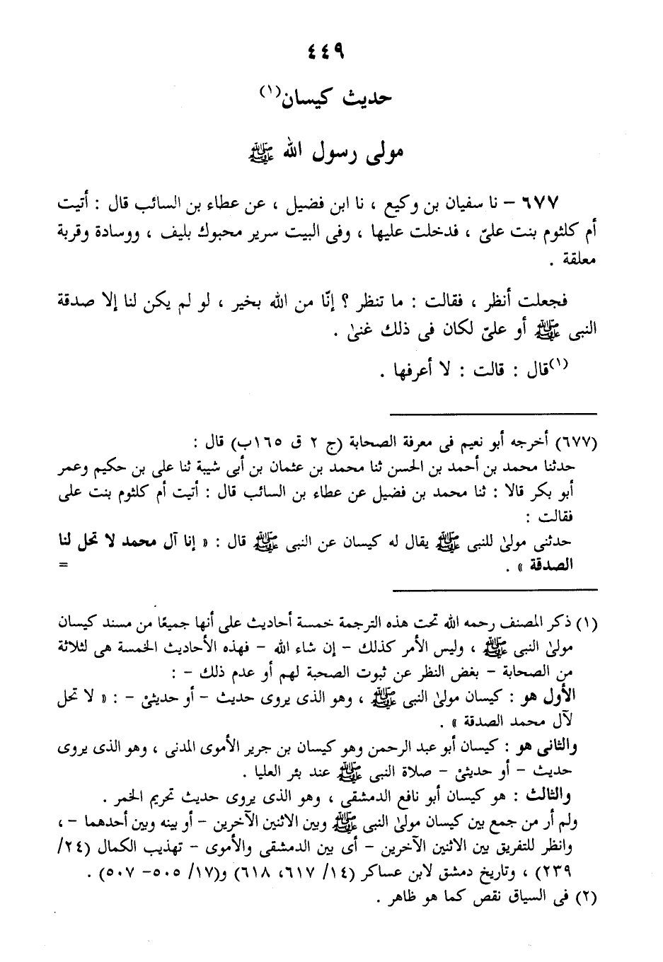 677 - نا سُفْيَانُ بْنُ وَكِيعٍ، نا ابْنُ فُضَيْلٍ، عَنْ عَطَاءِ بْنِ السَّائِبِ قَالَ: أَتَيْتُ أُمَّ كُلْثُومٍ بِنْتَ عَلِيٍّ، فَدَخَلْتُ عَلَيْهَا وَفِي الْبَيْتِ سَرِيرٌ مَحْبُوكٌ بِلِيفٍ وَوِسَادَةٌ وَقِرْبَةٌ مُعَلَّقَةٌ، فَجَعَلْتُ أَنْظُرُ فَقَالَتْ: مَا تَنْظُرُ، إِنَّا مِنَ اللَّهِ بِخَيْرٍ، لَوْ لَمْ يَكُنْ لَنَا إِلَّا صَدَقَةُ النَّبِيِّ صَلَّى اللهُ عَلَيْهِ وَسَلَّمَ أَوْ عَلِيٍّ لَكَانَ فِي ذَلِكَ غِنًى، قَالَ: قَالَتْ: لَا أَعْرِفُهَا -[450]-، قُلْتُ: خُذِيهَا، فَقَالَتْ: أَخْشَى أَنْ تَكُونَ صَدَقَةً، وَلَا تَحِلُّ لَنَا صَدَقَةٌ، وَلَكِنِ انْطَلِقْ فَتَصَدَّقْ بِهَا أَنْتَ، فَقُلْتُ: لَا، بَلْ تَصَدَّقِي بِهَا أَنْتِ، فَأَبَتْ ثُمَّ قَالَتْ: إنَّ مَوْلًى لِلنَّبِيِّ صَلَّى اللهُ عَلَيْهِ وَسَلَّمَ يُقَالُ لَهُ: كَيْسَانُ قَالَ لَهُ النَّبِيُّ صَلَّى اللهُ عَلَيْهِ وَسَلَّمَ فِي شَيْءٍ ذَكَرَهُ مِنْ أَمْرِ الصَّدَقَةِ: «§إِنَّا أَهْلَ الْبَيْتِ نُهِينَا أَنْ نَأْكُلَ الصَّدَقَةَ، وَإِنَّ مَوَالِيَنَا مِنْ أَنْفُسِنَا، فَلَا تَأْكُلِ الصَّدَقَةَ» ثُمَّ قَالَتْ: لَقَدْ جَاءَنِي الْبَارِحَةَ صُرَّةٌ مِنْ قِبَلِ الْعِرَاقِ فَرَدَدْتُهَا وَلَمْ أَقْبَلْهَا "