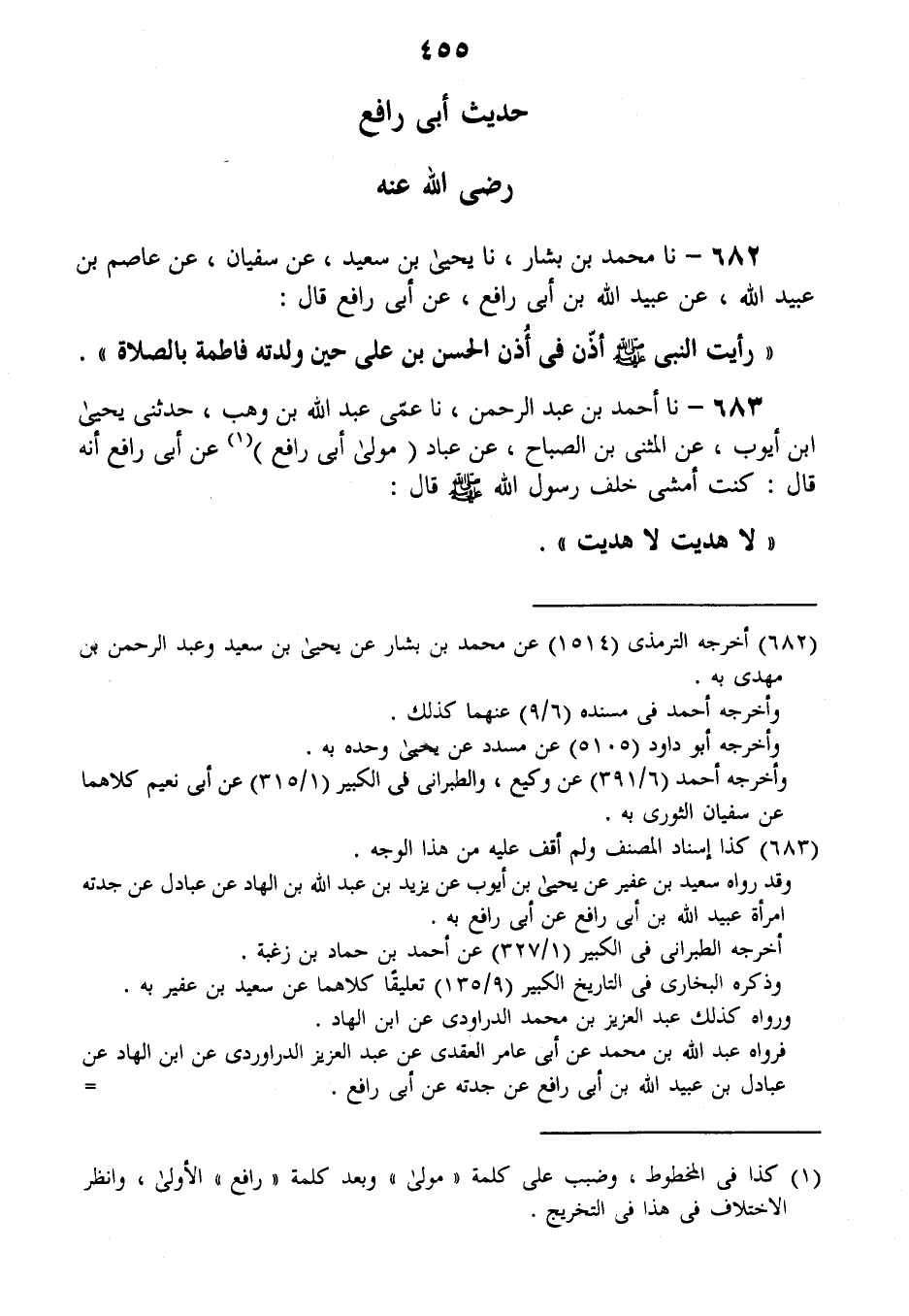 682 - نا مُحَمَّدُ بْنُ بَشَّارٍ، نا يَحْيَى بْنُ سَعِيدٍ، عَنْ سُفْيَانَ، عَنْ عَاصِمِ بْنِ عُبَيْدِ اللَّهِ، عَنْ عُبَيْدِ اللَّهِ بْنِ أَبِي رَافِعٍ، عَنْ أَبِي رَافِعٍ قَالَ: رَأَيْتُ النَّبِيَّ صَلَّى اللهُ عَلَيْهِ وَسَلَّمَ §أَذَّنَ فِي أُذُنِ الْحَسَنِ بْنِ عَلِيٍّ حِينَ وَلَدَتْهُ فَاطِمَةُ بِالصَّلَاةِ "