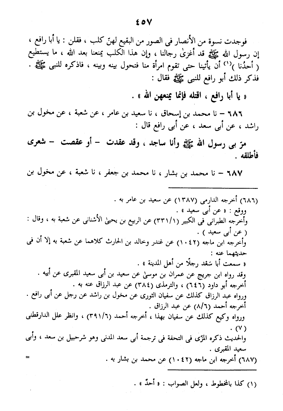 686 - نا مُحَمَّدُ بْنُ إِسْحَاقَ، نا سَعِيدُ بْنُ عَامِرٍ، عَنْ شُعْبَةَ، عَنْ مُخَوَّلِ بْنِ رَاشِدٍ، عَنْ أَبِي سَعْدٍ، عَنْ أَبِي رَافِعٍ قَالَ: «مَرَّ بِي رَسُولُ اللَّهِ صَلَّى اللهُ عَلَيْهِ وَسَلَّمَ §وِأَنَا سَاجِدٌ وَقَدْ عَقَدْتُ - أَوْ عَقَصْتُ - شَعْرِي فَأَطْلَقَهُ»