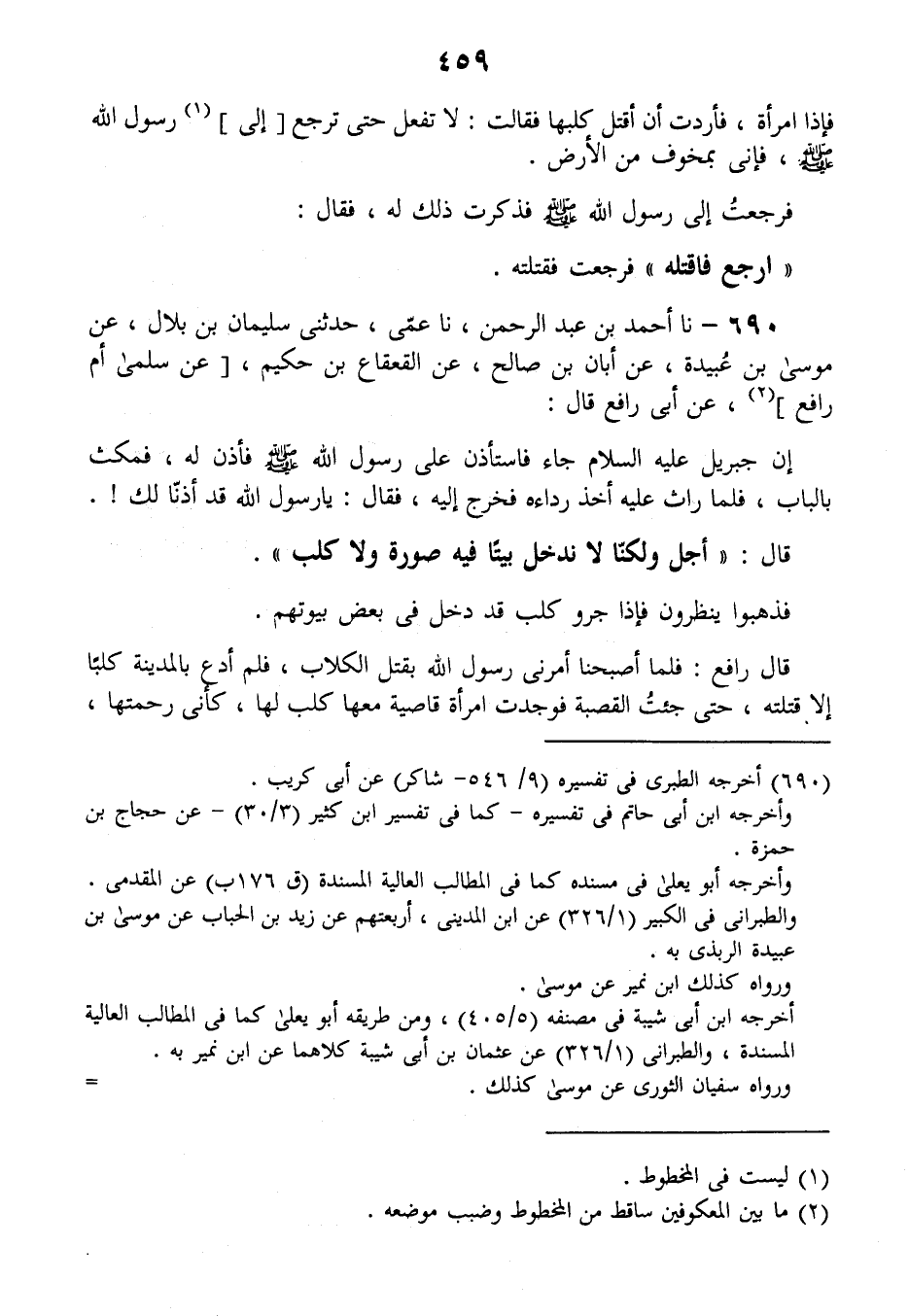 690 - نا أَحْمَدُ بْنُ عَبْدِ الرَّحْمَنِ، نا عَمِّي، حَدَّثَنِي سُلَيْمَانُ بْنُ بِلَالٍ، عَنْ مُوسَى بْنِ عُبَيْدَةَ، عَنْ أَبَانَ بْنِ صَالِحٍ، عَنِ الْقَعْقَاعِ بْنِ حَكِيمٍ، عَنْ سَلْمَى أُمِّ رَافِعٍ، عَنْ أَبِي رَافِعٍ قَالَ: إنَّ جِبْرِيلَ عَلَيْهِ السَّلَامُ جَاءَ فَاسْتَأْذَنَ عَلَى رَسُولِ اللَّهِ صَلَّى اللهُ عَلَيْهِ وَسَلَّمَ فَأَذِنَ لَهُ، فَمَكَثَ بِالْبَابِ، فَلَمَّا رَاثَ عَلَيْهِ أَخَذَ رِدَاءَهُ فَخَرَجَ إِلَيْهِ، فَقَالَ: «يَا رَسُولَ اللَّهِ، قَدْ أَذِنَّا لَكَ» قَالَ: أَجَلْ، §وَلَكِنَّا لَا نَدْخُلُ بَيْتًا فِيهِ صُورَةٌ وَلَا كَلْبٌ، فَذَهَبُوا يَنْظُرُونَ، فَإِذَا جِرْوُ كَلْبٍ قَدْ دَخَلَ فِي بَعْضِ بُيُوتِهِمْ، قَالَ رَافِعٌ: فَلَمَّا أَصْبَحْنَا أَمَرَنِي رَسُولُ اللَّهِ بِقَتْلِ الْكِلَابِ، فَلَمْ أَدَعْ بِالْمَدِينَةِ كَلْبًا إِلَّا قَتَلْتُهُ، حَتَّى جِئْتُ الْقَصَبَةَ فَوَجَدْتُ امْرَأَةً قَاصِيَةً مَعَهَا كَلْبٌ لَهَا، كَأَنِّي رَحِمْتُهَا -[460]-، فَجِئْتُ فَأَخْبَرْتُ بِالَّذِي صَنَعْتُ وَتَرْكِي ذَلِكَ الْكَلْبَ لِمَكَانِ صَاحِبَتِهِ، فَأَمَرَنِي، فَرَجَعْتُ فَقَتَلْتُهُ، قَالَ النَّاسُ: مَاذَا أُحِلَّ لَنَا مِنْ هَذِهِ الَّتِي أُمِرْتَ بِقَتْلِهَا؟ فَأَنْزَلَ اللَّهُ {يَسْأَلُونَكَ مَاذَا أُحِلَّ لَهُمْ قُلْ أُحِلَّ لَكُمُ الطَّيِّبَاتُ وَمَا عَلَّمْتُمْ مِنَ الْجَوَارِحِ} [المائدة: 4] الْآيَةَ كُلَّهَا