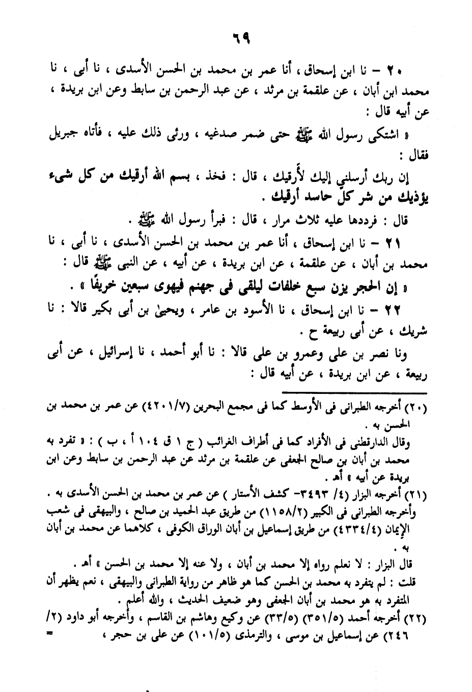 20 - نا ابْنُ إِسْحَاقَ، أَنَا عُمَرُ بْنُ مُحَمَّدِ بْنِ الْحَسَنِ الْأَسَدِيُّ، نا أَبِي، نا مُحَمَّدُ بْنُ أَبَانَ، عَنْ عَلْقَمَةَ بْنِ مَرْثَدٍ، عَنْ عَبْدِ الرَّحْمَنِ بْنِ سَابِطٍ، وَعَنِ ابْنِ بُرَيْدَةَ، عَنْ أَبِيهِ قَالَ: اشْتَكَى رَسُولُ اللَّهِ صَلَّى اللهُ عَلَيْهِ وَسَلَّمَ حَتَّى ضَمَّرَ صُدْغَيْهِ، وَرُئِي ذَلِكَ عَلَيْهِ، فَأَتَاهُ جِبْرِيلُ فَقَالَ: " إنَّ رَبِّكَ أَرْسَلَنِي إِلَيْكَ لِأَرْقِيَكَ، قَالَ: §فَخُذْ بِسْمِ اللَّهِ أَرْقِيكَ مِنْ كُلِّ شَيْءٍ يُؤْذِيكَ مِنْ شَرِّ كُلِّ حَاسِدٍ أَرْقِيكَ. قَالَ: فَرَدَّدَهَا عَلَيْهِ ثَلَاثَ مَرَّاتٍ قَالَ فَبَرَأَ رَسُولُ اللَّهِ صَلَّى اللهُ عَلَيْهِ وَسَلَّمَ "