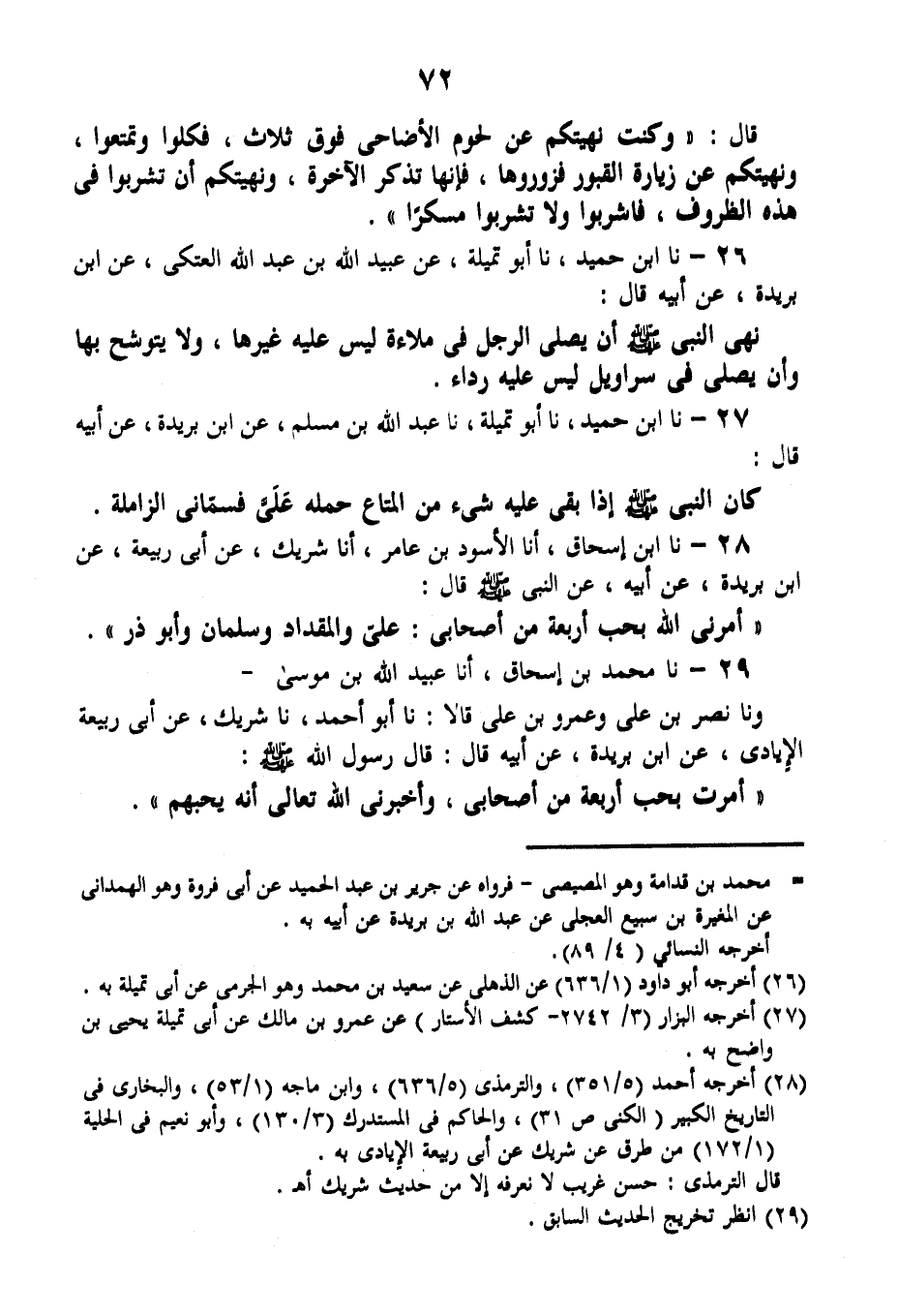 29 - نا مُحَمَّدُ بْنُ إِسْحَاقَ، أنا عُبَيْدُ اللَّهِ بْنُ مُوسَى، ونا نَصْرُ بْنُ عَلِيٍّ، وَعَمْرُو بْنُ عَلِيٍّ قَالَا: نا أَبُو أَحْمَدَ، نَا شَرِيكٌ، عَنْ أَبِي رَبِيعَةَ الْإِيَادِيِّ، عَنِ ابْنِ بُرَيْدَةَ، عَنْ أَبِيهِ، قَالَ: قَالَ رَسُولُ اللَّهِ صَلَّى اللهُ عَلَيْهِ وَسَلَّمَ: «§أُمِرْتُ بِحُبِّ أَرْبَعَةٍ مِنْ أَصْحَابِي، وَأَخْبَرَنِي اللَّهُ تَعَالَى أَنَّهُ يُحِبُّهُمْ» قُلْتُ: مَنْ هُمْ يَا رَسُولَ اللَّهِ؟ قَالَ: «فِيهِمْ عَلِيٌّ» قَالَ: ثُمَّ ذَكَرَ ذَلِكَ مِنَ الْغَدِ فَقُلْتُ: مَنْ هُمْ؟، قَالَ: «مِنْهُمْ عَلِيٌّ» ثُمَّ ذَكَرَ الْيَوْمَ الثَّانِي فَقُلْتُ: مَنْ هُمْ يَا رَسُولَ اللَّهِ؟ قَالَ: «مِنْهُمْ عَلِيٌّ» قَالَ ثُمَّ ذَكَرَ الْيَوْمَ الثَّالِثَ، فَقُلْتُ: مَنْ هُمْ؟ فَقَالَ: «مِنْهُمْ عَلِيٌّ، وَأَبُو ذَرٍّ الْغِفَارِيُّ، وَسَلْمَانُ الْفَارِسِيُّ، وَالْمِقْدَادُ بْنُ الْأَسْوَدِ الْكِنْدِيُّ»