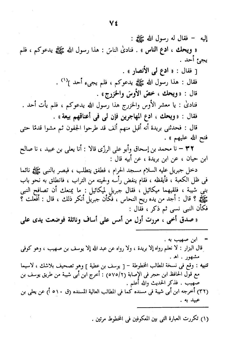 نا مُحَمَّدُ بْنُ إِسْحَاقَ، وَأَبُو عَلِيٍّ الرُّزِّيُّ قَالَا: أنا يَعْلَى بنُ عُبَيْدٍ، نا صَالِحُ بْنُ حَيَّانَ، عَنِ ابْنِ بُرَيْدَةَ، عَنْ أَبِيهِ، قَالَ: دَخَلَ جِبْرِيلُ عَلَيْهِ السَّلَامُ مَسْجِدَ الْحَرَامِ، فَطَفِقَ يَتَطَلَّبُ، فَبَصُرَ بِالنَّبِيِّ صَلَّى اللهُ عَلَيْهِ وَسَلَّمَ نَائِمًا فِي ظِلِّ الْكَعْبَةِ، فَأَيْقَظَهُ، فَقَامَ يَنْفُضُ رَأْسَهُ وَلِحْيَتَهُ مِنَ التُّرَابِ، فَانْطَلَقَ بِهِ نَحْوَ بَابِ بَنِي شَيْبَةَ، فَلَقِيَهُمَا مِيكَائِيلُ، فَقَالَ جِبْرِيلُ لِمِيكَائِيلَ: مَا يَمْنَعُكَ أَنْ تُصَافِحَ النَّبِيَّ صَلَّى اللهُ عَلَيْهِ وَسَلَّمَ؟ قَالَ: أَجِدُ مِنْ يَدِهِ رِيحَ النُّحَاسِ، فَكَأَنَّ جِبْرِيلَ أَنْكَرَ ذَلِكَ. قَالَ: أَفَعَلْتَ؟ فَكَأَنَّ النَّبِيَّ نَسِيَ ثُمَّ ذَكَرَ، فَقَالَ: " صَدَقَ أَخِي، §مَرَرْتُ أَوَّلَ أَمْسِ عَلَى إِسَافٍ وَنَائِلَةَ، فَوَضَعْتُ يَدِي عَلَى -[75]- أَحَدِهِمَا فَقُلْتُ: إنَّ قَوْمًا رَضُوا بِكُمَا إِلَهًا مَعَ اللَّهِ لَقَوْمُ سُوءٍ " قَالَ صَالِحٌ: فَقُلْتُ لِابْنِ بُرَيْدَةَ: مَا إِسَافٌ وَنَائِلَةُ؟ فَقَالَ: كَانَا شَابَّيْنِ مِنْ قُرَيْشٍ، فَكَانَا يَطُوفَانِ بِالْكَعْبَةِ، فَأَصَابَا مِنْهُ خَلْوَةً، فَأَرَادَ أَحَدُهُمَا صَاحِبَهُ، فَنَكَّسَهُمَا اللَّهُ نُحَاسًا، فَجَاءَ بِهِمَا قُرَيْشٌ فَقَالُوا: لَوْلَا أَنَّ اللَّهَ رَضِيَ أَنْ يُعْبَدَ هَذَانِ الْإِنْسَانَانِ لَمَا نَكَّسَهُمَا نُحَاسًا. قَالَ ابْنُ بُرَيْدَةَ: فَأَمَّا إِسَافٌ فَرَجُلٌ، وَأَمَّا نَائِلَةُ فَامْرَأَةٌ مِنْ بَنِي عَبْدِ الدَّارِ بنِ قُصَيٍّ "