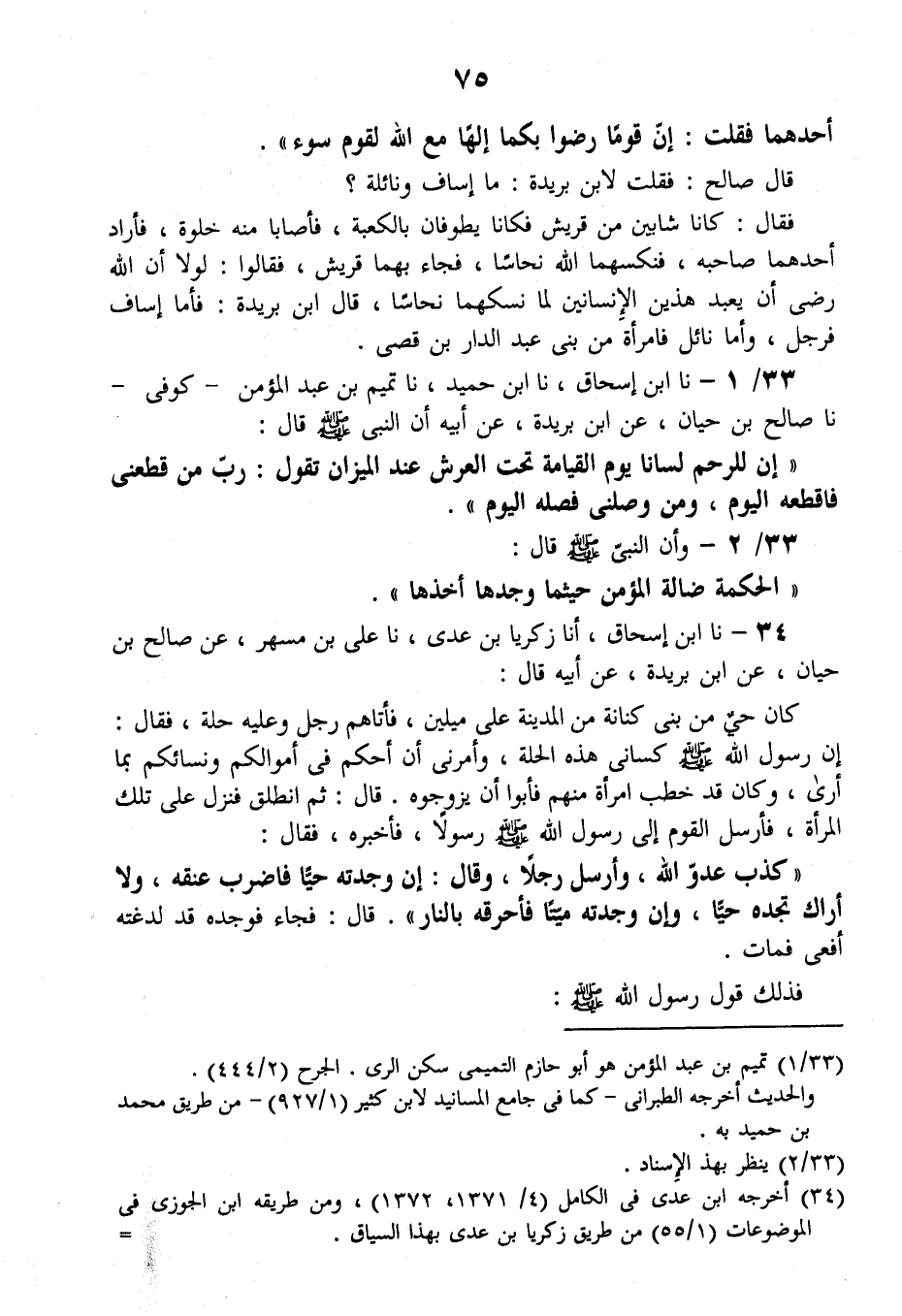 33 - نا ابْنُ إِسْحَاقَ، نا ابْنُ حُمَيْدٍ، نا تَمِيمُ بْنُ عَبْدِ الْمُؤْمِنِ، كُوفِيٌّ، نا صَالِحُ بْنُ حَيَّانَ، عَنِ ابْنِ بُرَيْدَةَ، عَنْ أَبِيهِ، أَنَّ النَّبِيَّ صَلَّى اللهُ عَلَيْهِ وَسَلَّمَ قَالَ: " إنَّ §لِلرَّحِمِ لِسَانًا يَوْمَ الْقِيَامَةِ تَحْتَ الْعَرْشِ عِنْدَ الْمِيزَانِ تَقُولُ: رَبِّ مَنْ قَطَعَنِي فَاقْطَعْهُ الْيَوْمَ، وَمَنْ وَصَلَنِي فَصِلْهُ الْيَوْمَ "
