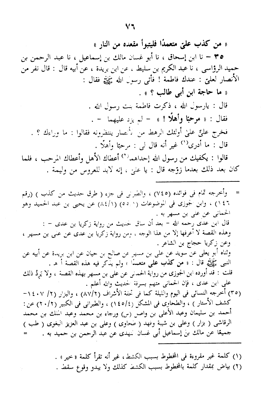 35 - نا ابْنُ إِسْحَاقَ، نا أَبُو غَسَّانَ مَالِكُ بْنُ إِسْمَاعِيلَ، نا عَبْدُ الرَّحْمَنِ بْنُ حُمَيْدٍ الرُّؤَاسِيُّ، نا عَبْدُ الْكَرِيمِ بْنُ سَلِيطٍ، عَنِ ابْنِ بُرَيْدَةَ، عَنْ أَبِيهِ قَالَ: قَالَ نَفَرٌ مِنَ الْأَنْصَارِ لَعَلَيٍّ: عِنْدَكَ فَاطِمَةُ فَأَتَى رَسُولَ اللَّهِ صَلَّى اللهُ عَلَيْهِ وَسَلَّمَ فَقَالَ: «مَا حَاجَةُ ابْنِ أَبِي طَالِبٍ؟» قَالَ: يَا رَسُولَ اللَّهِ، ذَكَرْتُ فَاطِمَةَ بِنْتَ رَسُولِ اللَّهِ. فَقَالَ: «مَرْحَبًا وَأَهْلًا» لَمْ يَزِدْ عَلَيْهِمَا، فَخَرَجَ عَلِيٌّ عَلَى أُولَئِكَ الرَّهْطِ مِنَ الْأَنْصَارِ يَنْتَظِرُونَهُ فَقَالُوا: مَا وَرَاءَكَ؟ قَالَ: مَا أَدْرِي غَيْرَ أنَّهُ قَالَ لِي: مَرْحَبًا وَأَهْلًا. قَالُوا: يَكْفِيكَ مِنْ رَسُولِ اللَّهِ إِحْدَاهُمَا، أَعْطَاكَ الْأَهْلَ وَأَعْطَاكَ الْمَرْحَبَ. فَلَمَّا كَانَ بَعْدَ ذَلِكَ بَعْدَمَا زَوَّجَهُ قَالَ: «§يَا عَلِيُّ، إِنَّهُ لَا بُدَّ لِلْعَرُوسِ مِنْ وَلِيمَةٍ» -[77]- فَقَالَ سَعْدٌ: مِنْ عِنْدِي كَبْشٌ، وَجَمَعَ لَهُ رَهْطٌ مِنَ الْأَنْصَارِ آصُعًا مِنْ ذُرَةٍ، فَلَمَّا كَانَ لَيْلَةُ الْبِنَاءِ قَالَ: «لَا تُحْدِثْ شَيْئًا حَتَّى تَلْقَانِي» فَدَعَا رَسُولُ اللَّهِ صَلَّى اللهُ عَلَيْهِ وَسَلَّمَ بِمَاءٍ فَتَوَضَّأَ مِنْهُ، ثُمَّ أَفْرَغَهُ عَلَى عَلِيٍّ فَقَالَ: «اللَّهُمَّ بَارِكْ فِيهِمَا وَبَارِكْ عَلَيْهِمَا، وَبَارِكْ لَهُمَا فِي نَسْلِهِمَا»