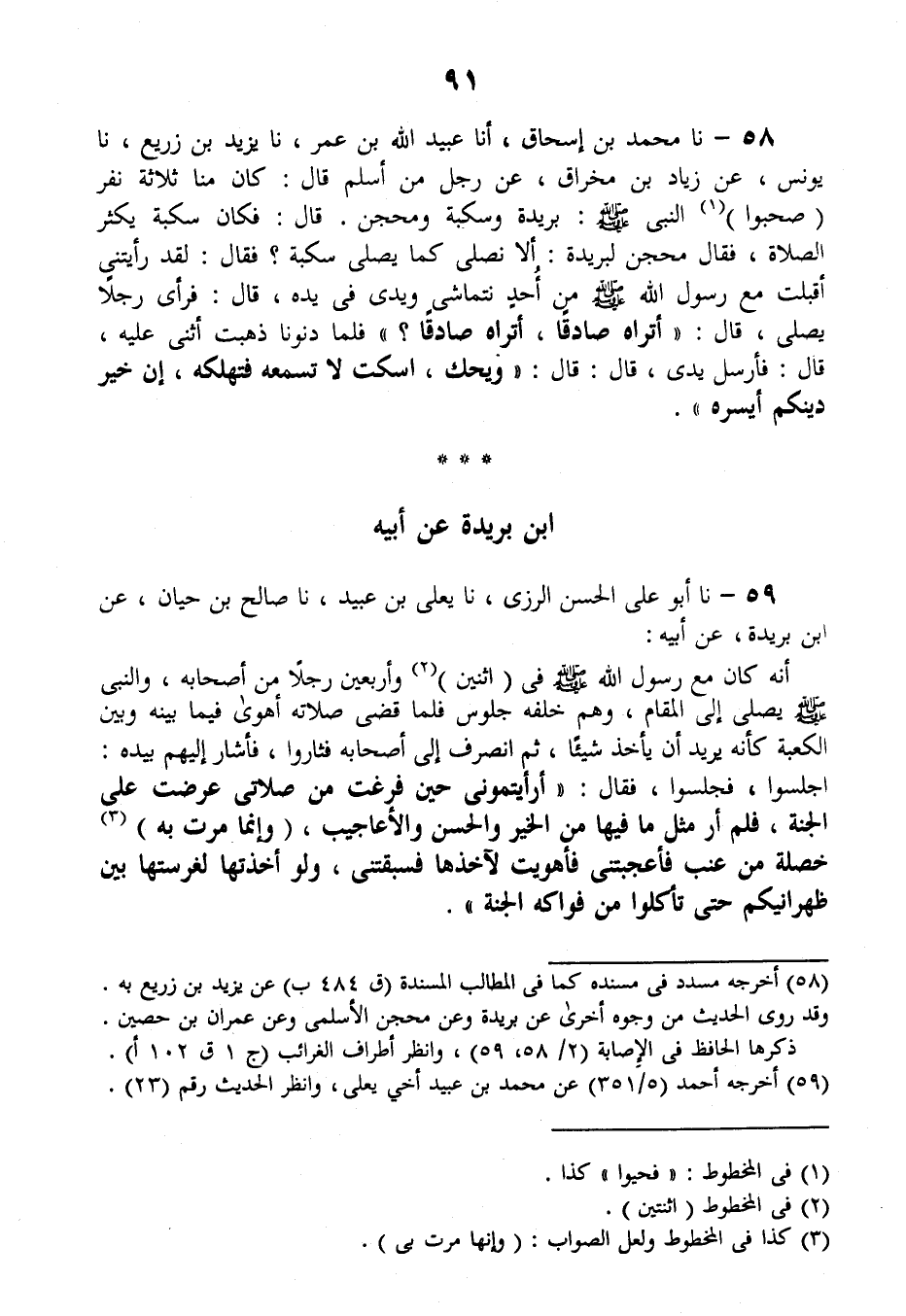 58 - نا مُحَمَّدُ بْنُ إِسْحَاقَ، أنا عُبَيْدُ اللَّهِ بْنُ عُمَرَ، نا يَزِيدُ بْنُ زُرَيْعٍ، نا يُونُسُ، عَنْ زِيَادِ بْنِ مِخْرَاقٍ، عَنْ رَجُلٍ مِنْ أَسْلَمَ قَالَ: كَانَ مِنَّا ثَلَاثَةُ نَفَرٍ صَحِبُوا النَّبِيَّ صَلَّى اللهُ عَلَيْهِ وَسَلَّمَ: بُرَيْدَةُ، وَسُكْبَةُ، وَمِحْجَنٌ. قَالَ: فَكَانَ سُكْبَةُ يُكْثِرُ الصَّلَاةَ، فَقَالَ مِحْجَنٌ لِبُرَيْدَةَ: أَلَا نُصَلِّي كَمَا يُصَلِّي سُكْبَةُ؟ فَقَالَ: لَقَدْ رَأَيْتُنِي أَقْبَلَتُ مَعَ رَسُولِ اللَّهِ صَلَّى اللهُ عَلَيْهِ وَسَلَّمَ مِنْ أُحُدٍ نَتَمَاشَى، وَيَدِي فِي يَدِهِ، قَالَ: فَرَأَى رَجُلًا يُصَلِّي، قَالَ: «أَتَرَاهُ صَادِقًا، أَتُرَاهُ صَادِقًا؟» فَلَمَّا دَنَوْنَا ذَهَبْتُ أُثْنِي عَلَيْهِ، قَالَ: فَأَرْسَلَ يَدِي، قَالَ: قَالَ: «§وَيْحَكَ اسْكُتْ لَا تُسْمِعْهُ فَتُهْلِكَهُ، إنَّ خَيْرَ دِينِكُمْ أَيْسَرُهُ»