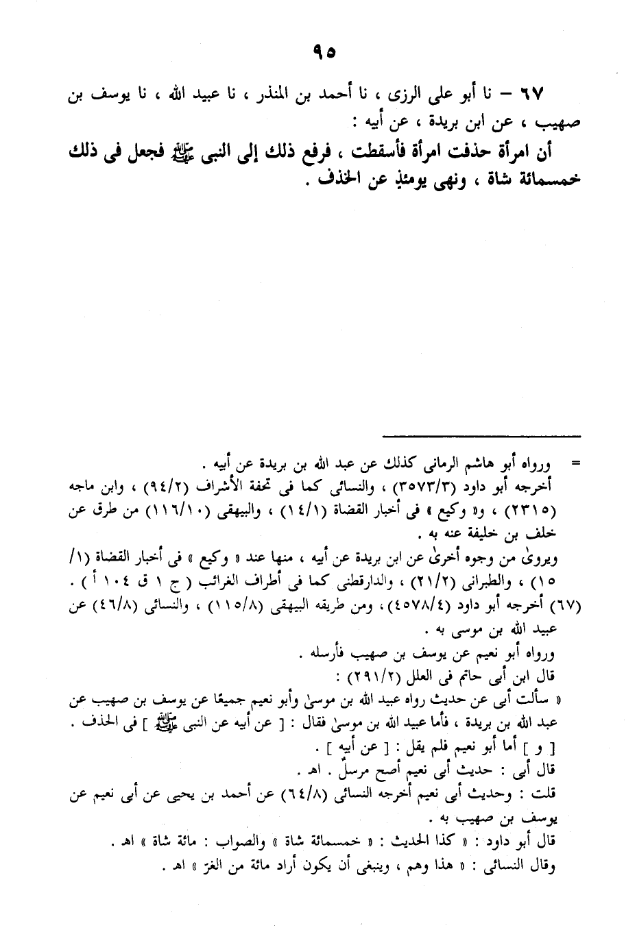 67 - نا أَبُو عَلِيٍّ الرُّزِّيُّ، نا أَحْمَدُ بْنُ الْمُنْذِرِ، نا عُبَيْدُ اللَّهِ، نا يُوسُفُ بْنُ صُهَيْبٍ، عَنِ ابْنِ بُرَيْدَةَ، عَنْ أَبِيهِ أَنَّ §امْرَأَةً حَذَفَتِ امْرَأَةً فَأَسْقَطَتْ، فَرُفِعَ ذَلِكَ إِلَى النَّبِيِّ صَلَّى اللهُ عَلَيْهِ وَسَلَّمَ فَجَعَلَ فِي ذَلِكَ خَمْسَمَائَةِ شَاةٍ، وَنَهَى يَوْمَئِذٍ عَنِ الْخَذْفِ "