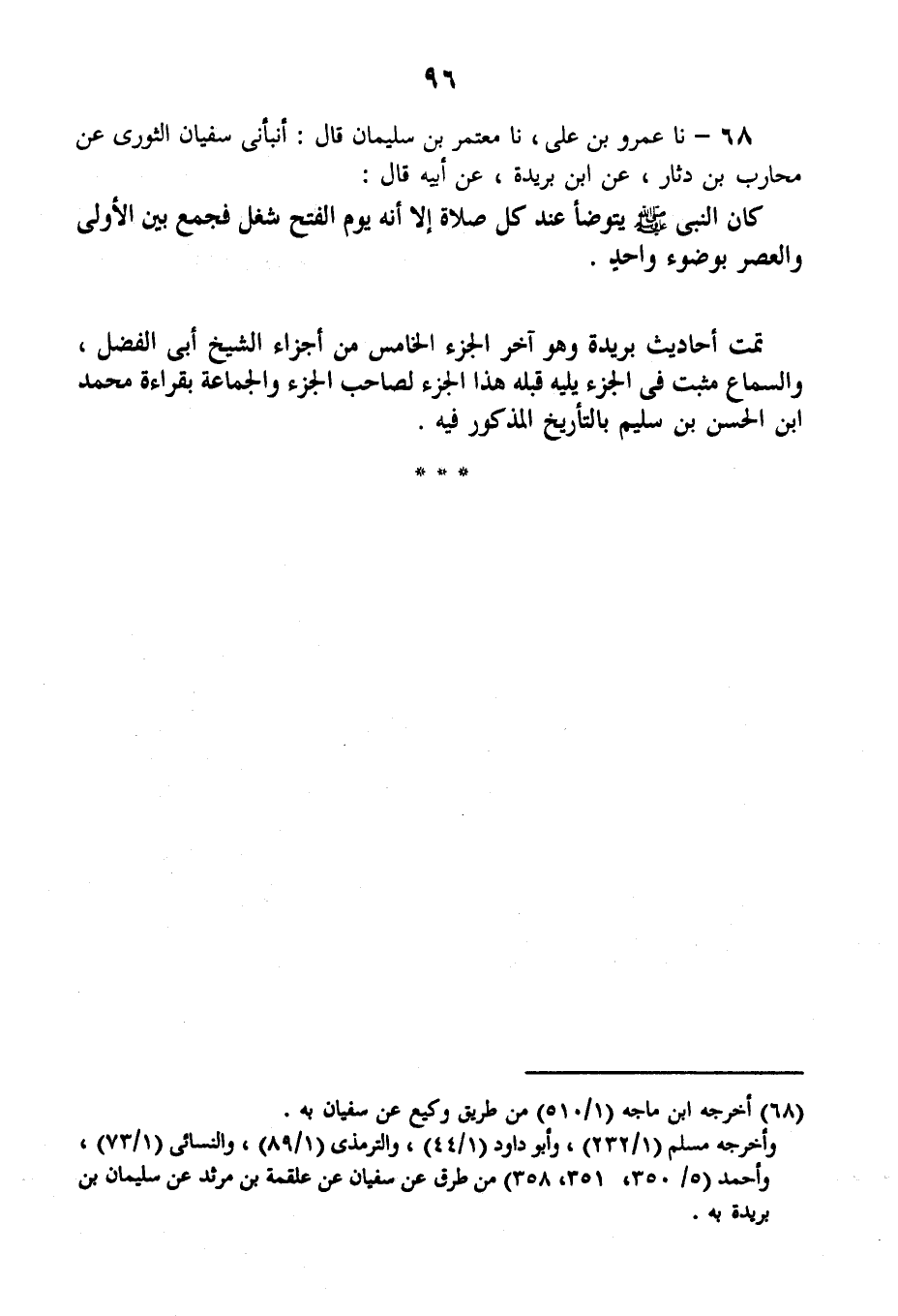 68 - نا عَمْرُو بْنُ عَلِيٍّ، نا مُعْتَمِرُ بْنُ سُلَيْمَانَ قَالَ: أَنْبَأَنِي سُفْيَانُ الثَّوْرِيُّ، عَنْ مُحَارِبِ بْنِ دِثَارٍ، عَنِ ابْنِ بُرَيْدَةَ، عَنْ أَبِيهِ، قَالَ: كَانَ النَّبِيُّ صَلَّى اللهُ عَلَيْهِ وَسَلَّمَ §يَتَوَضَّأُ عِنْدَ كُلِّ صَلَاةٍ، إِلَّا أَنَّهُ يَوْمَ الْفَتْحِ شُغِلَ فَجَمَعَ بَيْنَ الْأُولَى، وَالْعَصْرِ بِوُضُوءٍ وَاحِدٍ "