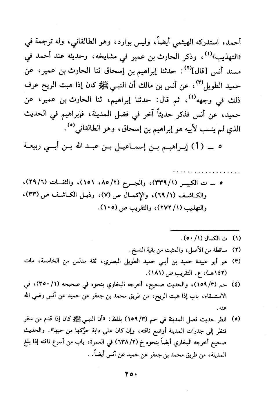 أَحْمد استدركه الهيثمي أَيْضا وَلَيْسَ بوارد وَهُوَ الطَّالقَانِي وَله تَرْجَمَة فِي التَّهْذِيب وَذكر الْحَارِث بن عُمَيْر فِي مشايخه وَحَدِيثه عِنْد أَحْمد فِي مُسْند أنس قَالَ حَدثنَا إِبْرَاهِيم بن إِسْحَاق ثَنَا الْحَارِث بن عُمَيْر عَن حميد الطَّوِيل عَن أنس بن مَالك ان النَّبِي صلى الله عَلَيْهِ وَسلم كَانَ إِذا هبت الرّيح عرف ذَلِك فِي وَجهه ثمَّ قَالَ حَدثنَا إِبْرَاهِيم ثَنَا الْحَارِث بن عُمَيْر عَن حميد عَن أنس فَذكر حَدِيثا آخر فِي فضل الْمَدِينَة فإبراهيم فِي الحَدِيث الَّذِي لم ينْسب لِأَبِيهِ هُوَ إِبْرَاهِيم بن إِسْحَاق وَهُوَ الطَّالقَانِي
