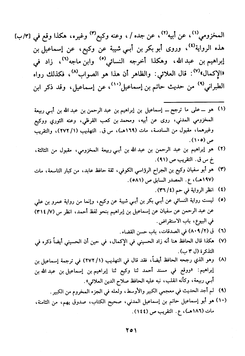 المَخْزُومِي عَن أَبِيه عَن جده وَعنهُ وَكِيع وَغَيره هَكَذَا وَقع فِي هَذِه الرِّوَايَة وروى أَبُو بكر بن أبي شيبَة عَن وَكِيع عَن إِسْمَاعِيل بن إِبْرَاهِيم بن عبد الله وَهَكَذَا أخرجه النَّسَائِيّ وَابْن ماجة زَاد فِي الْإِكْمَال قَالَ العلائي وَالظَّاهِر ان هَذَا هُوَ الصَّوَاب فَكَذَلِك رَوَاهُ الطَّبَرَانِيّ من حَدِيث حَاتِم بن إِسْمَاعِيل عَن إِسْمَاعِيل وَقد ذكر ابْن