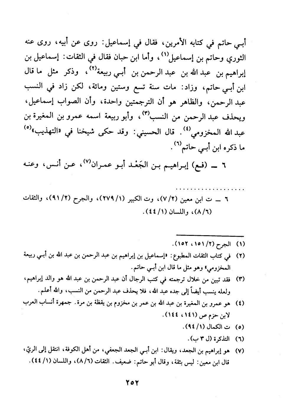 أبي حَاتِم فِي كِتَابه الْأَمريْنِ فَقَالَ فِي إِسْمَاعِيل روى عَن أَبِيه روى عَنهُ الثَّوْريّ وحاتم بن إِسْمَاعِيل واما بن حبَان فَقَالَ فِي الثِّقَات إِسْمَاعِيل بن إِبْرَاهِيم بن عبد الله بن عبد الرَّحْمَن بن أبي ربيعَة وَذكر مثل مَا قَالَ بن أبي حَاتِم وَزَاد مَاتَ سنة تسع وَسِتِّينَ وَمِائَة لَكِن زَاد فِي النّسَب عبد الرَّحْمَن وَالظَّاهِر هُوَ ان الترجمتين وَاحِدَة وان الصَّوَاب إِسْمَاعِيل ويحذف عبد الرَّحْمَن من النّسَب وَأَبُو ربيعَة اسْمه عَمْرو بن الْمُغيرَة بن عبد الله المَخْزُومِي قَالَ الْحُسَيْنِي وَقد حكى شَيخنَا فِي التَّهْذِيب مَا ذكره بن أبي حَاتِم