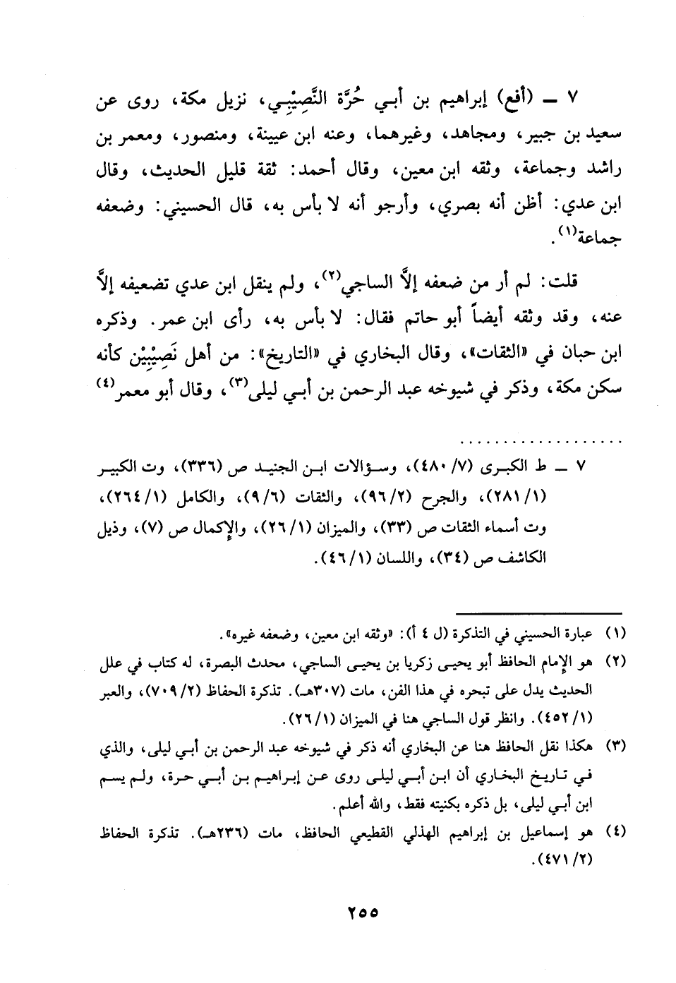 7 - (افع) إِبْرَاهِيم بن أبي حرَّة النصيبي نزيل مَكَّة روى عَن سعيد بن جُبَير وَمُجاهد وَغَيرهمَا وَعنهُ بن عُيَيْنَة وَمَنْصُور وَمعمر بن رَاشد وَجَمَاعَة وَثَّقَهُ بن معِين وَقَالَ أَحْمد ثِقَة قَلِيل الحَدِيث وَقَالَ بن عدي اظن انه بصرى وَأَرْجُو انه لَا بَأْس بِهِ قَالَ الْحُسَيْنِي وَضَعفه جمَاعَة