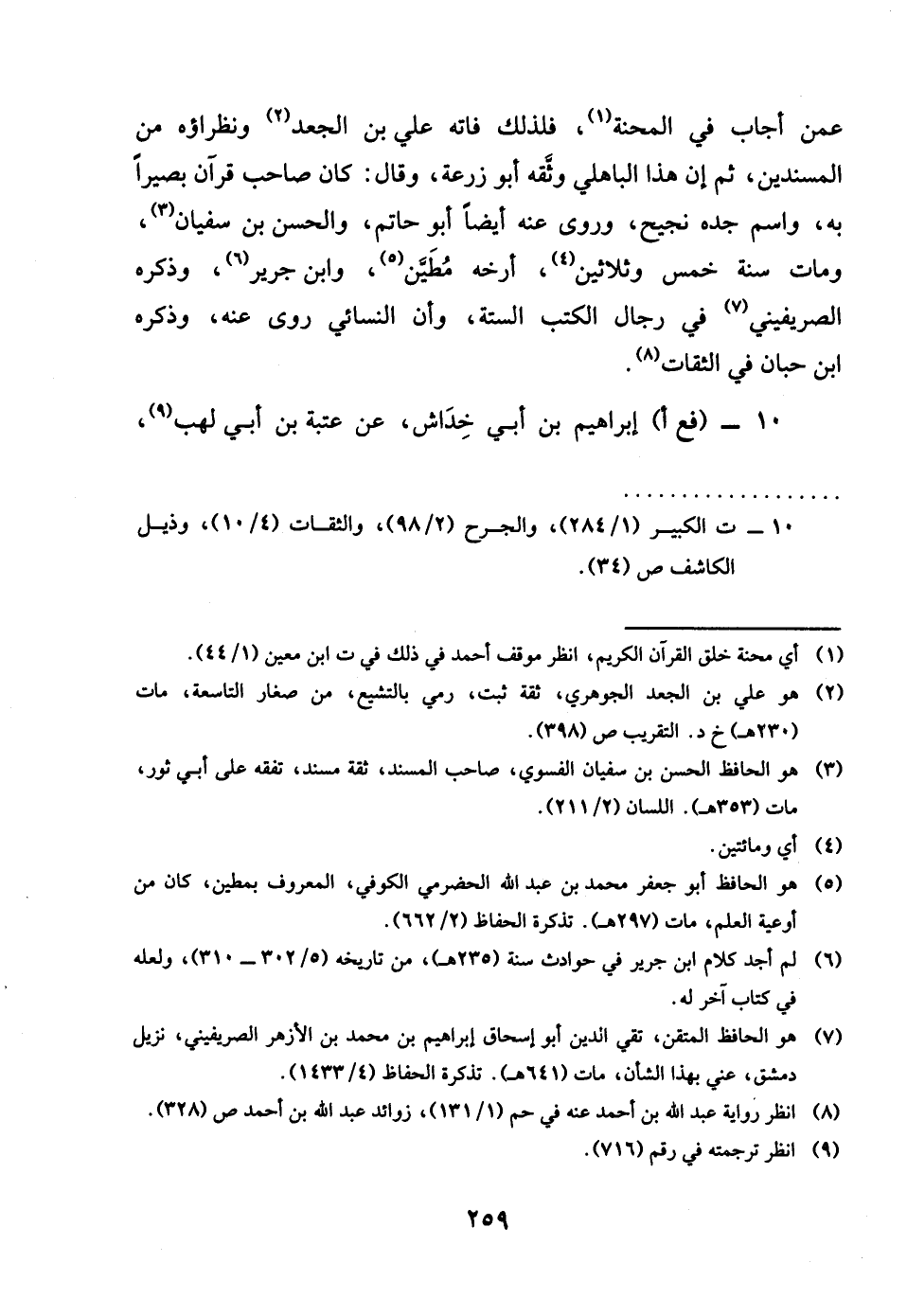 عَن من أجَاب فِي المحنة وَلذَلِك فَاتَهُ عَليّ بن الْجَعْد ونظراؤه من المسندين ثمَّ ان هَذَا الْبَاهِلِيّ وَثَّقَهُ أَبُو زرْعَة وَقَالَ كَانَ صَاحب قُرْآن بَصيرًا بِهِ وَاسم جده نجيح وروى عَنهُ أَيْضا أَبُو حَاتِم وَالْحسن بن سُفْيَان وَمَات سنة خمس وَثَلَاثِينَ أرخه مطين وَابْن جرير وَابْن حبَان فِي الثِّقَات وَذكره الصريفيني فِي رجال الْكتب السِّتَّة وان النَّسَائِيّ روى عَنهُ وذكره ابْن حبَان فِي الثِّقَات.