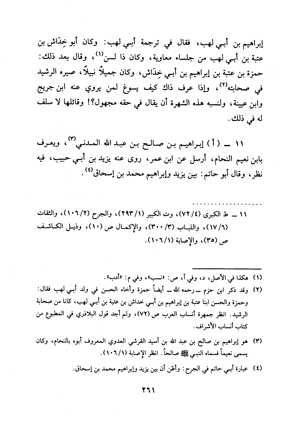 إِبْرَاهِيم بن أبي لَهب فَقَالَ فِي تَرْجَمَة أبي لَهب وَكَانَ أَبُو خِدَاش بن عتبَة بن أبي لَهب من جلساء مُعَاوِيَة وَكَانَ ذَا نسب وَقَالَ بعد ذَلِك وَمن ولد أبي لَهب حَمْزَة بن عتبَة بن إِبْرَاهِيم بن أبي خِدَاش وَكَانَ جميلا نبيلا صيره الرشيد فِي صحابته وَإِذا عرف ذَلِك كَيفَ يسوغ لمن يرْوى عَنهُ بن جريج وَابْن عُيَيْنَة وَنسبه بِهَذِهِ الشُّهْرَة ان يُقَال فِي حَقه مَجْهُول وقائلها لَا سلف لَهُ فِي ذَلِك
