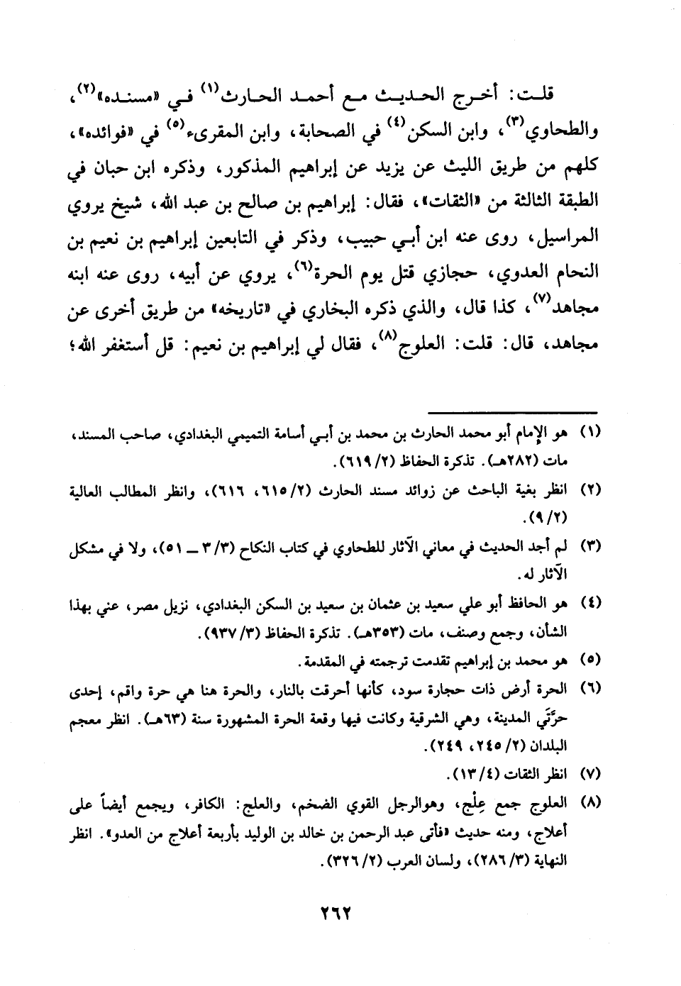 قلت اخْرُج الحَدِيث مَعَ أَحْمد الْحَارِث فِي مُسْنده والطَّحَاوِي وَابْن السكن فِي الصَّحَابَة وَابْن المقرىء فِي فَوَائده كلهم من طَرِيق اللَّيْث عَن يزِيد عَن إِبْرَاهِيم الْمَذْكُور وَذكره بن حبَان فِي الطَّبَقَة الثَّالِثَة من الثِّقَات فَقَالَ إِبْرَاهِيم بن صَالح بن عبد الله شيخ يروي الْمَرَاسِيل روى عَنهُ بن أبي حبيب وَذكر فِي التَّابِعين إِبْرَاهِيم بن نعيم بن النحام الْعَدوي حجازي قتل يَوْم الْحرَّة يروي عَن أَبِيه روى عَنهُ ابْنه مُجَاهِد كَذَا قَالَ وَالَّذِي ذكره البُخَارِيّ فِي تَارِيخه من طَرِيق أُخْرَى عَن مُجَاهِد قَالَ قلت العلوج فَقَالَ لي إِبْرَاهِيم بن نعيم قل اسْتغْفر الله