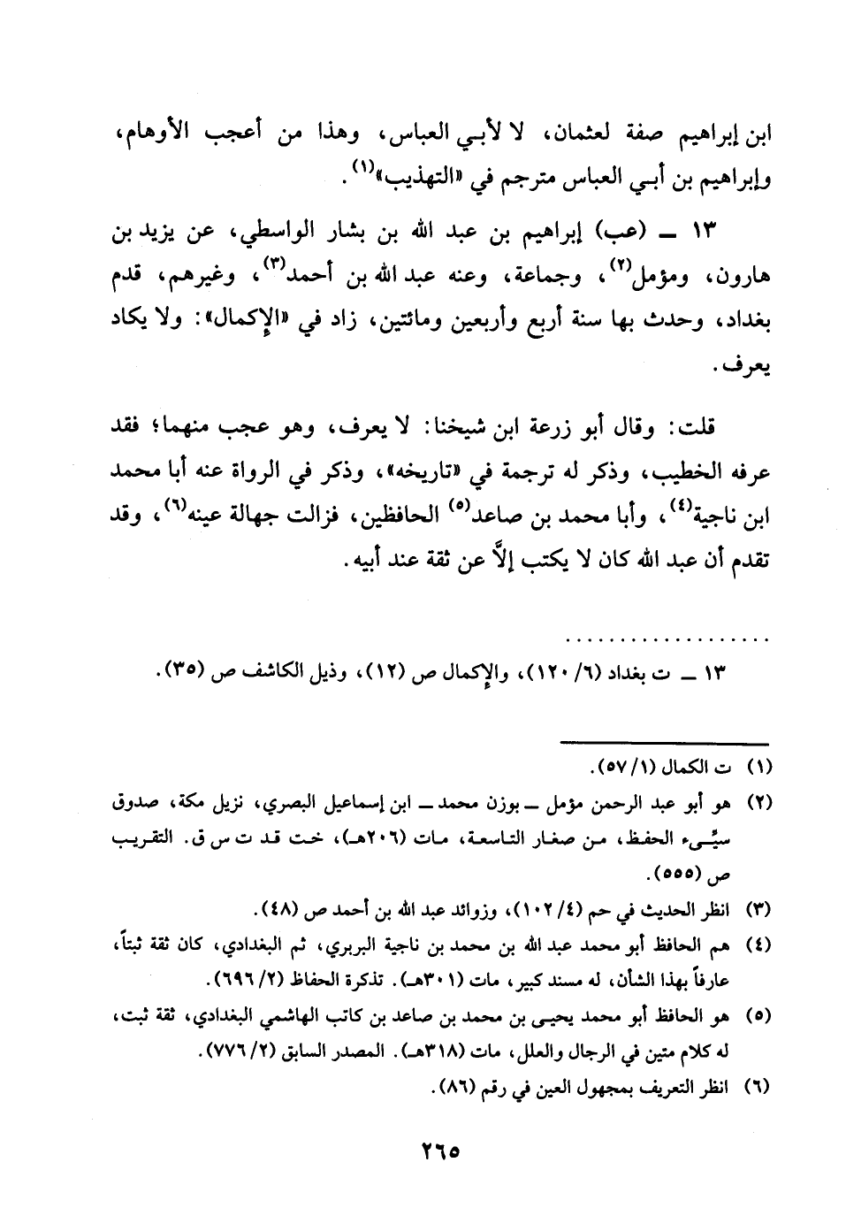 13 - عب إِبْرَاهِيم بن عبد الله بن بشار الوَاسِطِيّ عَن يزِيد بن هَارُون ومؤمل وَجَمَاعَة وَعنهُ عبد الله بن أَحْمد وَغَيره قدم بَغْدَاد وَحدث بهَا سنة أَربع وَأَرْبَعين وَمِائَتَيْنِ زَاد فِي الْإِكْمَال وَلَا يكَاد يعرف قلت وَقَالَ أَبُو زرْعَة بن شَيخنَا لَا يعرف وَهُوَ عجب مِنْهُمَا فقد عرفه الْخَطِيب وَذكر لَهُ تَرْجَمَة فِي تَارِيخه وَذكر فِي الروَاة عَنهُ أَبَا مُحَمَّد بن نَاجِية وَأَبا مُحَمَّد بن صاعد الحافظين فَزَالَتْ جَهَالَة عينه وَقد تقدم ان عبد الله كَانَ لَا يكْتب الا عَن ثِقَة عِنْد أَبِيه
