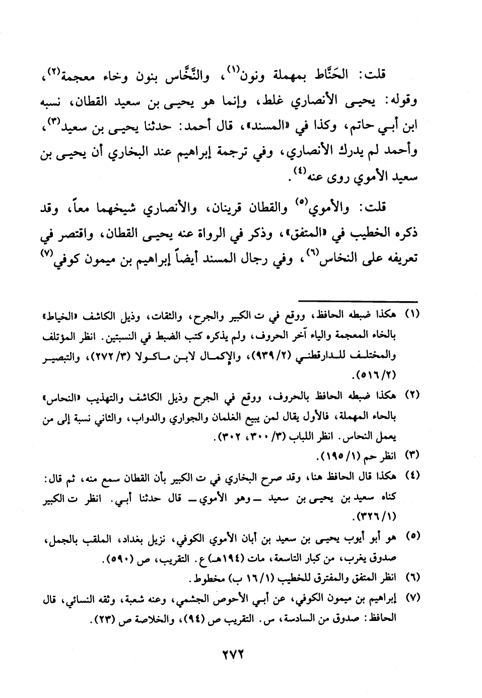 قلت الحناط بِمُهْملَة وَنون والنخاس بنُون وخاء مُعْجمَة وَقَوله يحيى الْأنْصَارِيّ غلط وانما هُوَ يحيى بن سعيد الْقطَّان نسبه بن أبي حَاتِم وَكَذَا فِي الْمسند قَالَ أَحْمد حَدثنَا يحيى بن سعيد وَأحمد لم يدْرك الْأنْصَارِيّ وَفِي تَرْجَمَة إِبْرَاهِيم عِنْد البُخَارِيّ ان يحيى بن سعيد الْأمَوِي روى عَنهُ قلت والاموي وَالْقطَّان قرينان والانصاري شيخهما مَعًا وَقد ذكره الْخَطِيب فِي الْمُتَّفق وَذكر فِي الرِّوَايَة عَنهُ يحيى الْقطَّان وَاقْتصر فِي تَعْرِيفه على النخاس وَفِي رجال الْمسند أَيْضا إِبْرَاهِيم بن مَيْمُون كُوفِي