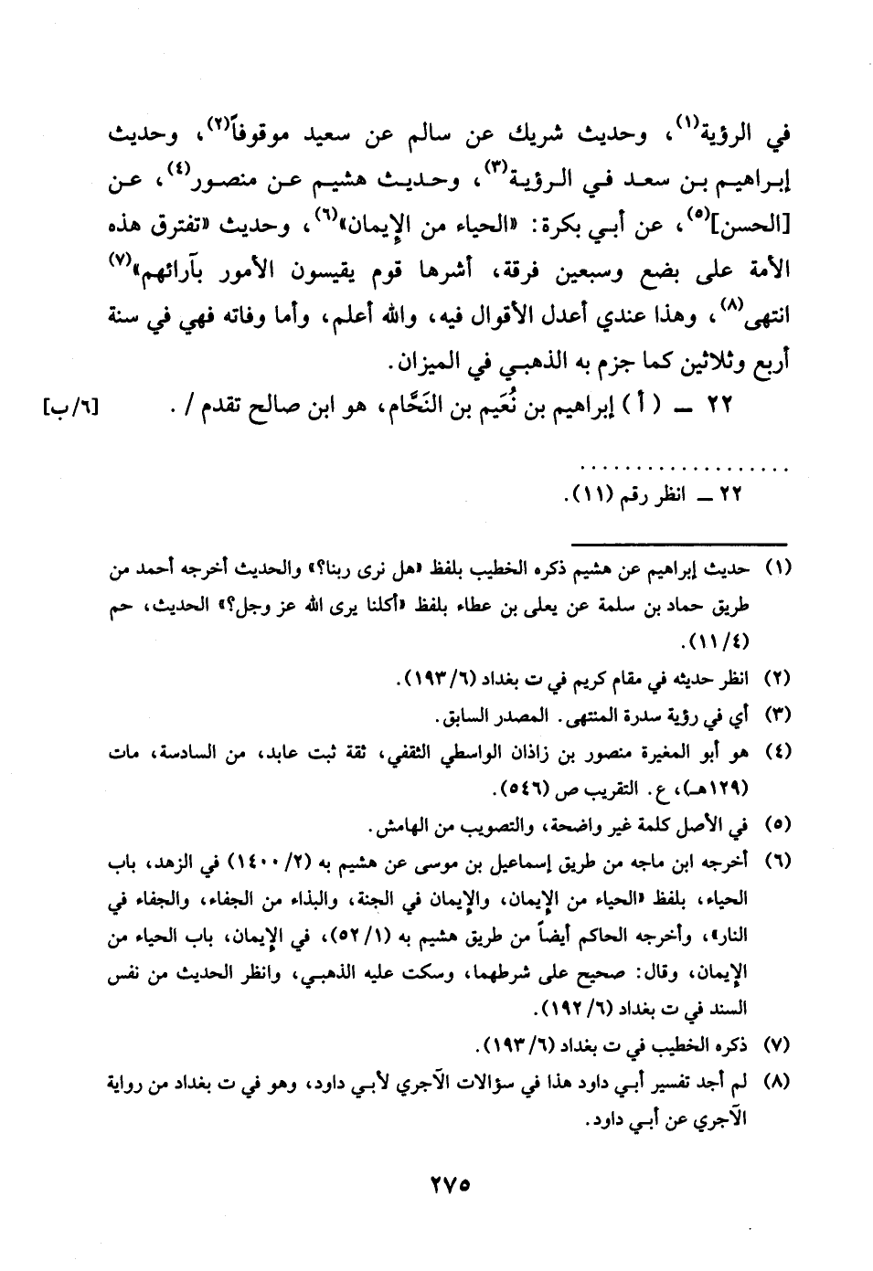 فِي الرُّؤْيَة وَحَدِيث شريك عَن سَالم عَن سعيد مَوْقُوفا وَحَدِيث إِبْرَاهِيم بن سعد فِي الرُّؤْيَة وَحَدِيث هشيم عَن مَنْصُور عَن الْحسن عَن أبي بكرَة الْحيَاء من الْإِيمَان وَحَدِيث تفترق هَذِه الْأمة على بضع وَسبعين فرقة اشرها قوم يقيسون الْأُمُور بأرائهم انْتهى وَهَذَا عِنْدِي اعْدِلْ الْأَقْوَال فِيهِ وَالله اعْلَم واما وَفَاته فَهِيَ فِي سنة أَربع وَثَلَاثِينَ كَمَا جزم بِهِ الذَّهَبِيّ فِي الْمِيزَان
