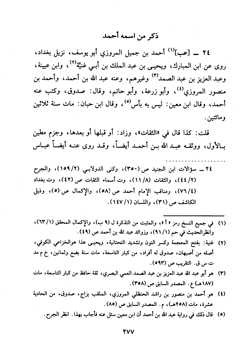 24 - عب أَحْمد بن جميل الْمروزِي أَبُو يُوسُف نزيل بَغْدَاد روى عَن بن الْمُبَارك وَيحيى بن عبد الْملك بن أبي غنية وَابْن عُيَيْنَة وَعبد الْعَزِيز بن عبد الصَّمد وَغَيرهم وَعنهُ عبد الله بن أَحْمد وَأحمد بن مَنْصُور الْمروزِي وَأَبُو زرْعَة وَأَبُو حَاتِم وَقَالَ صَدُوق وَكتب عَنهُ أَحْمد وَقَالَ بن معِين لَيْسَ بِهِ بَأْس وَقَالَ بن حبَان مَاتَ سنة ثَلَاثِينَ وَمِائَتَيْنِ