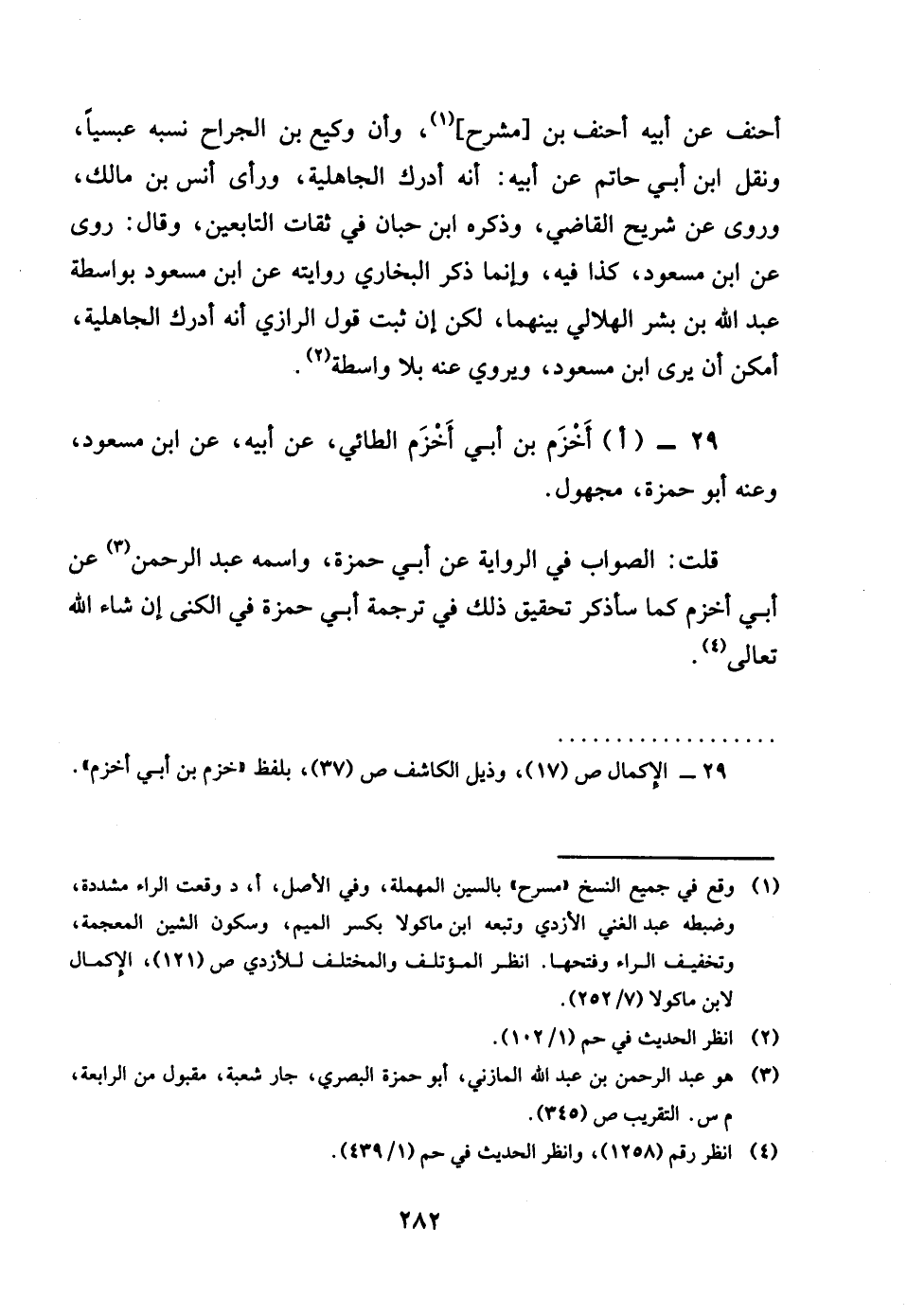 29 - اأخزم بن أبي أخزم الطَّائِي عَن أَبِيه عَن بن مَسْعُود وَعنهُ أَبُو حَمْزَة مَجْهُول قلت الصَّوَاب فِي الرِّوَايَة عَن أبي حَمْزَة واسْمه عبد الرَّحْمَن عَن أبي أخزم كَمَا ساذكر تَحْقِيق ذَلِك فِي تَرْجَمَة أبي حَمْزَة فِي الكنى ان شَاءَ الله تَعَالَى