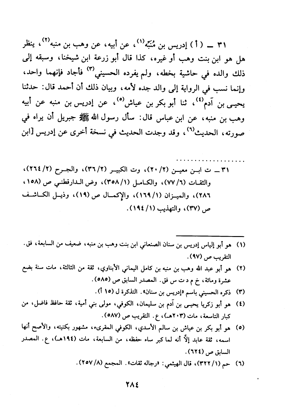 31 - اإِدْرِيس بن مُنَبّه عَن أَبِيه عَن وهب بن مُنَبّه ينظر هَل هُوَ بن بنت وهب أَو غَيره كَذَا قَالَ أَبُو زرْعَة بن شَيخنَا وَسَبقه الى ذَلِك وَالِده فِي حَاشِيَة بِخَطِّهِ وَلم يفرده الْحُسَيْنِي فأجاد فَإِنَّهُمَا وَاحِد وانما نسب فِي الرِّوَايَة الى وَالِد جده لامه وَبَيَان ذَلِك ان أَحْمد قَالَ حَدثنَا يحيى بن آدم ثَنَا أَبُو بكر بن عَيَّاش عَن إِدْرِيس بن مُنَبّه عَن أَبِيه وهب بن مُنَبّه عَن بن عَبَّاس قَالَ سَأَلَ رَسُول الله صلى الله عَلَيْهِ وَسلم جِبْرِيل ان يرَاهُ فِي صورته الحَدِيث وَقد وجدت الحَدِيث فِي نُسْخَة أُخْرَى عَن إِدْرِيس بن