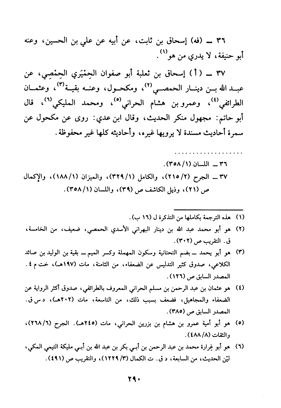 37 - اإِسْحَاق بن ثَعْلَبَة أَبُو صَفْوَان الْحِمْيَرِي الْحِمصِي عَن عبد الله بن دِينَار الْحِمصِي وَمَكْحُول وَعنهُ بَقِيَّة وَعُثْمَان الطرائفي وَعَمْرو بن هِشَام الْحَرَّانِي وَمُحَمّد الْمليكِي قَالَ أَبُو حَاتِم مَجْهُول مُنكر الحَدِيث وَقَالَ بن عدي روى عَن مَكْحُول عَن سَمُرَة أَحَادِيث مُسندَة لَا يَرْوِيهَا غَيره وَأَحَادِيثه كلهَا غير مَحْفُوظَة