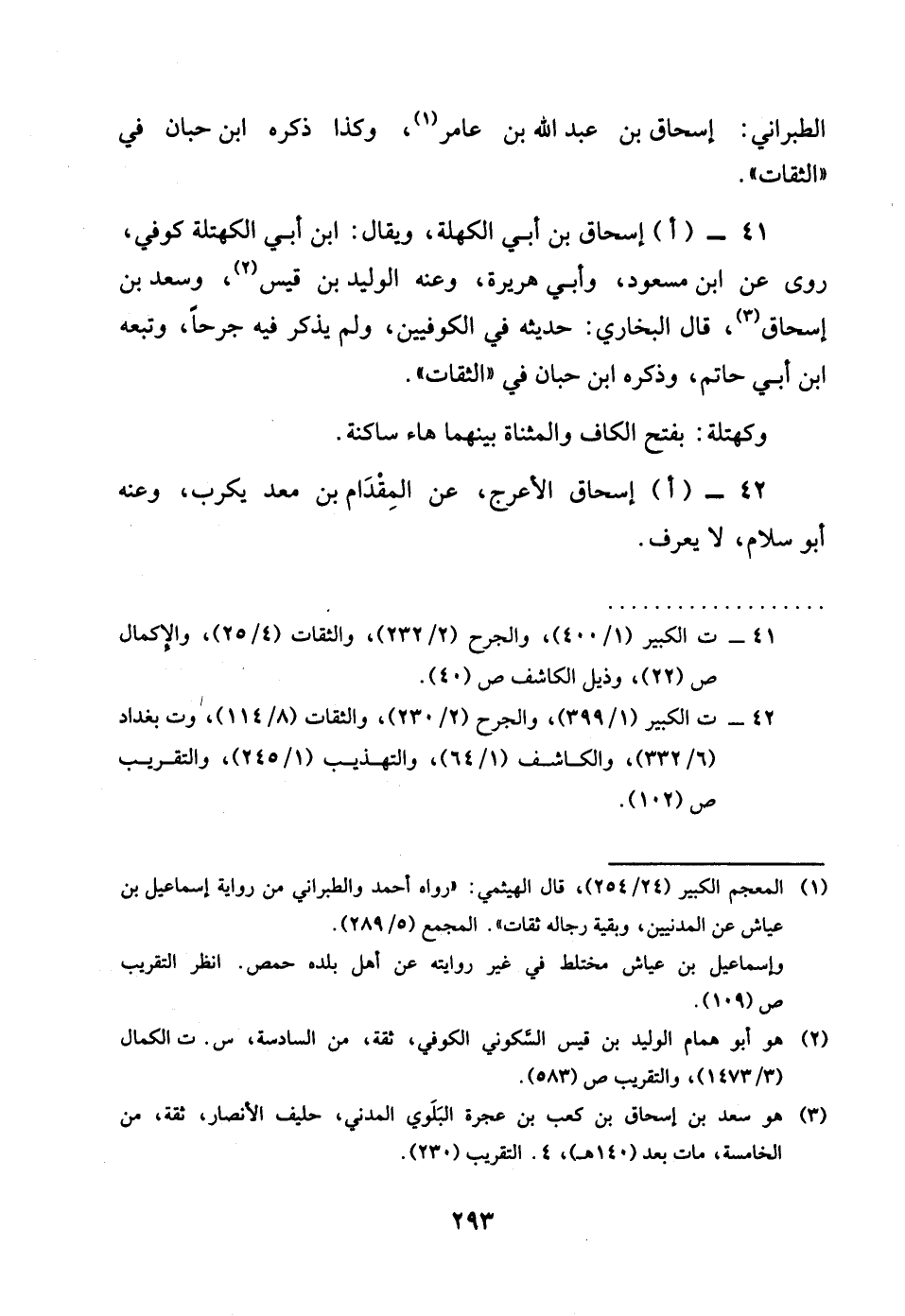 41 - اإِسْحَاق بن أبي الكهلة وَيُقَال بن أبي الكهتلة كُوفِي روى عَن بن مَسْعُود وَأبي هُرَيْرَة وَعنهُ الْوَلِيد بن قيس وَسعد بن إِسْحَاق قَالَ البُخَارِيّ حَدِيثه فِي الْكُوفِيّين وَلم يذكر فِيهِ جرحا وَتَبعهُ بن أبي حَاتِم وَذكره بن حبَان فِي الثِّقَات وكهتلة بِفَتْح الْكَاف والمثناة بَينهمَا هَاء سَاكِنة
