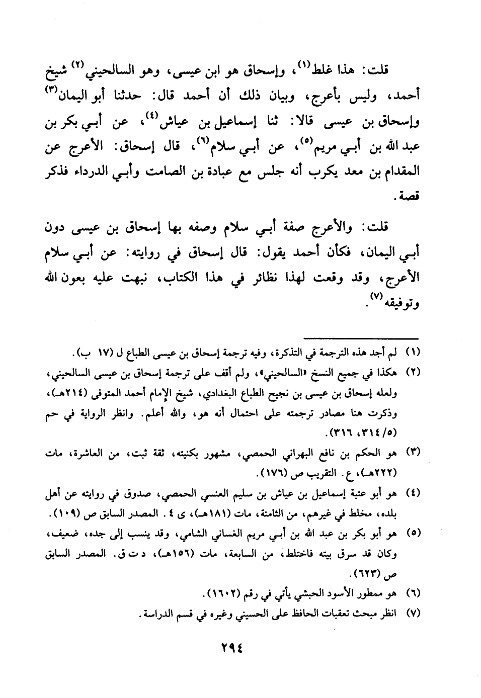 قلت هَذَا غلط وَإِسْحَاق هُوَ بن عِيسَى وَهُوَ السالحيني شيخ أَحْمد وَلَيْسَ باعرج وَبَيَان ذَلِك ان أَحْمد قَالَ حَدثنَا أَبُو الْيَمَان وَإِسْحَاق بن عِيسَى قَالَا ثَنَا إِسْمَاعِيل بن عَيَّاش عَن أبي بكر بن عبد الله بن أبي مَرْيَم عَن أبي سَلام قَالَ إِسْحَاق الْأَعْرَج عَن الْمِقْدَام بن معد يكرب انه جلس مَعَ عبَادَة بن الصَّامِت وَأبي الدَّرْدَاء فَذكر قصَّة قلت والأعرج صفة أبي سَلام وَصفه بهَا إِسْحَاق بن عِيسَى دون أبي الْيَمَان فَكَأَن أَحْمد يَقُول قَالَ إِسْحَاق فِي رِوَايَته عَن أبي سَلام الْأَعْرَج وَقد وَقعت لهَذَا نَظَائِر فِي هَذَا الْكتاب نبهت عَلَيْهَا بعون الله تَعَالَى وتوفيقه