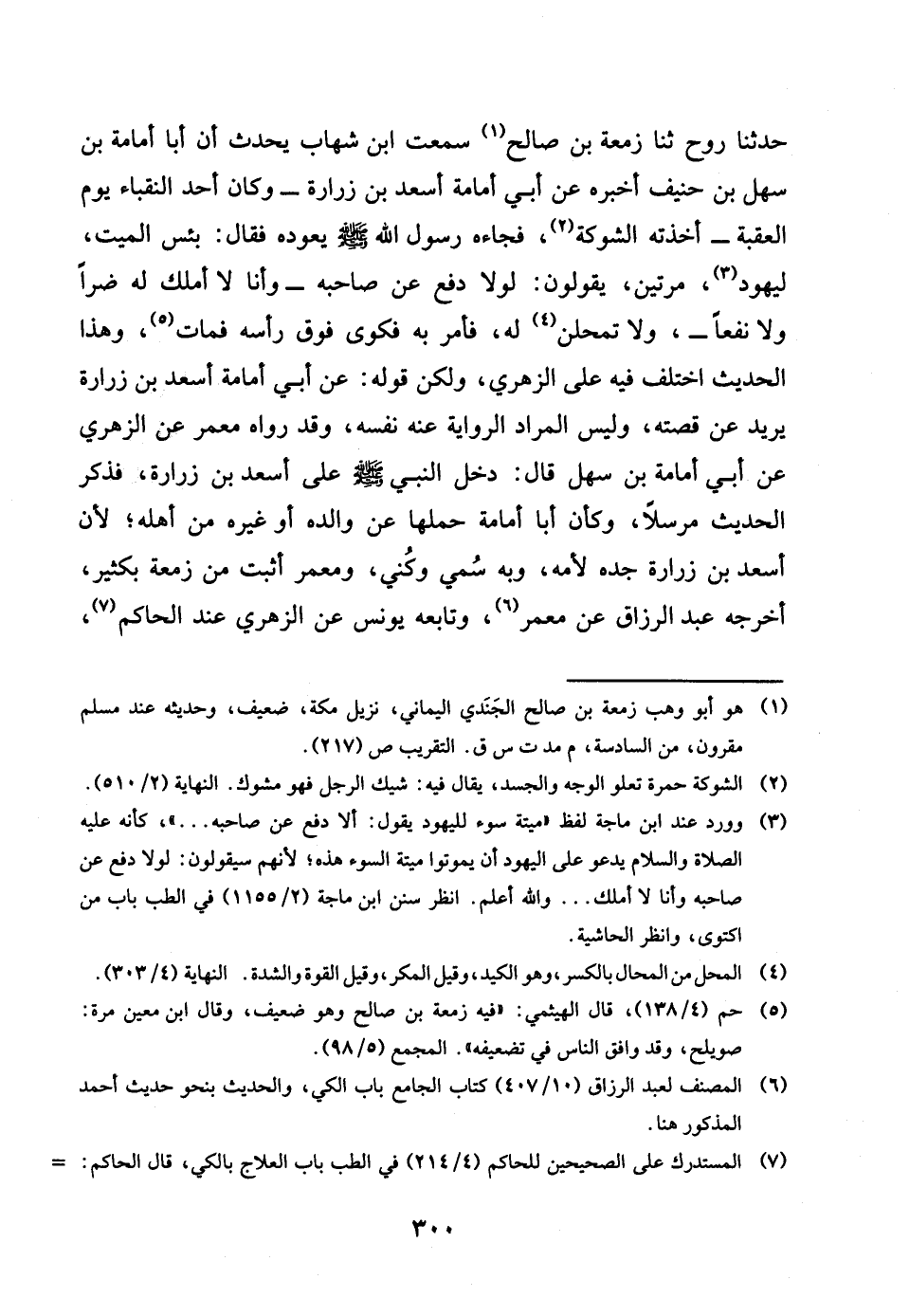 حَدثنَا روح ثَنَا زَمعَة بن صَالح سَمِعت بن شهَاب يحدث ان أَبَا امامة بن سهل بن حنيف أخبرهُ عَن أبي امامة اِسْعَدْ بن زُرَارَة وَكَانَ أحد النُّقَبَاء يَوْم الْعقبَة أَخَذته الشَّوْكَة فَجَاءَهُ رَسُول الله صلى الله عَلَيْهِ وَسلم يعودهُ فَقَالَ بئس الْمَيِّت ليهود مرَّتَيْنِ يَقُولُونَ لَوْلَا دفع عَن صَاحبه وَأَنا لَا املك لَهُ ضرا وَلَا نفعا وَلَا تمحلن لَهُ فَأمر بِهِ فكوى فَوق رَأسه فَمَاتَ وَهَذَا الحَدِيث اخْتلف فِيهِ على الزُّهْرِيّ وَلَكِن قَوْله عَن أبي امامة اِسْعَدْ بن زُرَارَة يُرِيد عَن قصَّته وَلَيْسَ المُرَاد الرِّوَايَة عَنهُ نَفسه وَقد رَوَاهُ معمر عَن الزُّهْرِيّ عَن أبي امامة بن سهل قَالَ دخل النَّبِي صلى الله عَلَيْهِ وَسلم على اِسْعَدْ بن زُرَارَة فَذكر الحَدِيث مُرْسلا وَكَأن أَبَا امامة حملهَا عَن وَالِده أَو غَيره من أَهله لَان اِسْعَدْ بن زُرَارَة جده لامه وَبِه سمي وكني وَمعمر اثْبتْ من زَمعَة بِكَثِير أخرجه عبد الرَّزَّاق عَن معمر وَتَابعه يُونُس عَن الزُّهْرِيّ عِنْد الْحَاكِم