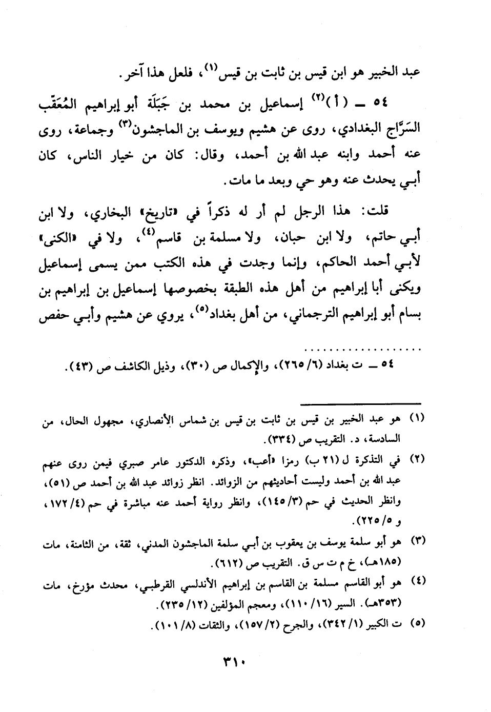 54 - اإِسْمَاعِيل بن مُحَمَّد بن جبلة أَبُو إِبْرَاهِيم المعقب السراج الْبَغْدَادِيّ روى عَن هشيم ويوسف بن الْمَاجشون وَجَمَاعَة روى عَنهُ أَحْمد وَابْنه عبد الله بن أَحْمد وَقَالَ كَانَ من خِيَار النَّاس كَانَ أبي يحدث عَنهُ وَهُوَ حَيّ وَبعد مَا مَاتَ قلت هَذَا الرجل لم ار لَهُ ذكرا فِي تَارِيخ البُخَارِيّ وَلَا بن أبي حَاتِم وَلَا بن حبَان وَلَا مسلمة بن قَاسم وَلَا فِي الكنى لأبي أَحْمد الْحَاكِم وانما وجدت فِي هَذِه الْكتب مِمَّن يُسمى إِسْمَاعِيل ويكنى أَبَا إِبْرَاهِيم من أهل هَذِه الطَّبَقَة بخصوصها إِسْمَاعِيل بن إِبْرَاهِيم بن بسأم أَبُو إِبْرَاهِيم الترجماني من أهل بَغْدَاد يرْوى عَن هشيم وَأبي حَفْص