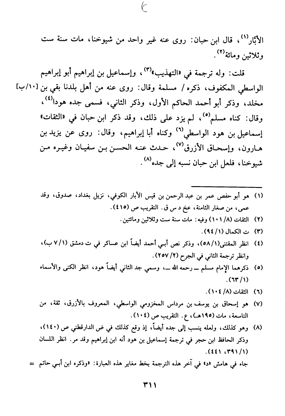 الْأَبَّار قَالَ بن حبَان روى عَنهُ غير وَاحِد من شُيُوخنَا مَاتَ سنة سِتّ وَثَلَاثِينَ وَمِائَة قلت وَله تَرْجَمَة فِي التَّهْذِيب وَإِسْمَاعِيل بن إِبْرَاهِيم أَبُو إِبْرَاهِيم الوَاسِطِيّ المكفوف ذكره مسلمة وَقَالَ روى عَنهُ من أهل بلدنا بَقِي بن مخلد وَذكر أَبُو أَحْمد الْحَاكِم الأول وَذكر الثَّانِي فَسمى جده هوذا قَالَ كناه مُسلم لم يزدْ على ذَلِك وَقد ذكر بن حبَان فِي الثِّقَات إِسْمَاعِيل بن هود الوَاسِطِيّ وكناه أَبَا إِبْرَاهِيم وَقَالَ روى عَن يزِيد بن هَارُون وَإِسْحَاق الْأَزْرَق حدث عَنهُ الْحسن بن سُفْيَان وَغَيره من شُيُوخنَا فَلَعَلَّ بن حبَان نسبه الى جده