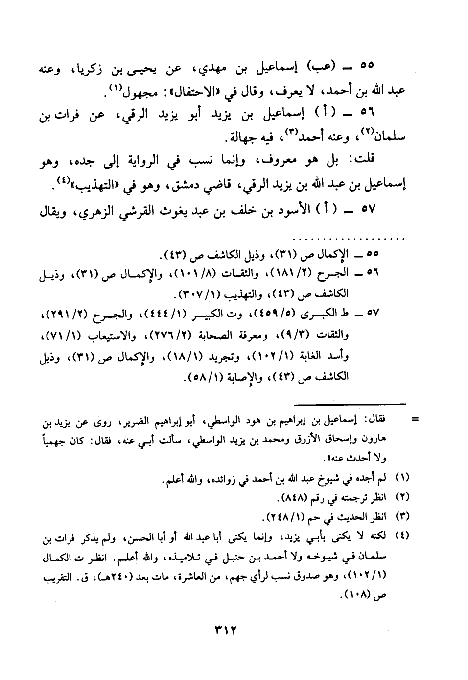 56 - اإِسْمَاعِيل بن يزِيد أَبُو يزِيد الرقي عَن فرات بن سلمَان وَعنهُ أَحْمد فِيهِ جَهَالَة قلت بل هُوَ مَعْرُوف وانما نسب فِي الرِّوَايَة الى جده وَهُوَ إِسْمَاعِيل بن عبد الله بن يزِيد الرقى قاضى دمشق وَهُوَ فِي التَّهْذِيب