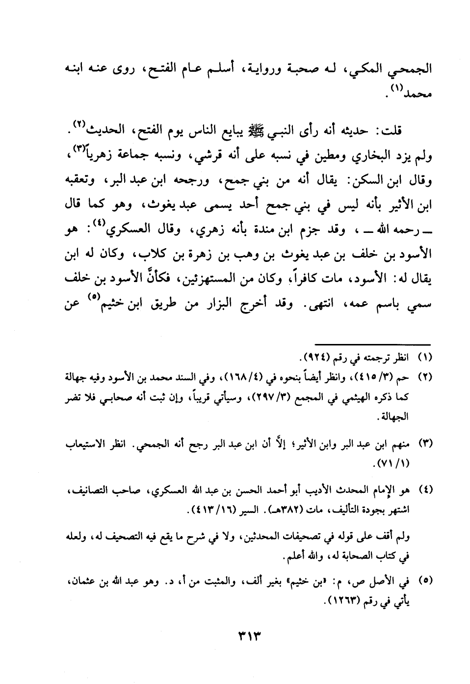 الجُمَحِي الْمَكِّيّ لَهُ صُحْبَة وَرِوَايَة اسْلَمْ عَام الْفَتْح روى عَنهُ ابْنه مُحَمَّد قلت حَدِيثه انه رأى النَّبِي صلى الله عَلَيْهِ وَسلم يُبَايع النَّاس يَوْم الْفَتْح الحَدِيث وَلم يزدْ البُخَارِيّ ومطين فِي نسبه على انه قرشي وَنسبه جمَاعَة زهريا وَقَالَ بن السكن يُقَال انه من بنى جمح وَرجحه بن عبد الْبر وَتعقبه بن الْأَثِير بِأَنَّهُ لَيْسَ فِي بنى جمح أحد يُسمى عبد يَغُوث وَهُوَ كَمَا قَالَ رَحمَه الله وَقد جزم بن مندة بِأَنَّهُ زهري وَقَالَ العسكري هُوَ الْأسود بن خلف بن عبد يَغُوث بن وهب بن زهرَة بن كلاب وَكَانَ لَهُ بن يُقَال لَهُ الْأسود مَاتَ كَافِرًا وَكَانَ من الْمُسْتَهْزِئِينَ فَكَأَن الْأسود بن خلف سمي باسم عَمه انْتهى وَقد اخْرُج الْبَزَّار من طَرِيق بن خثيم عَن