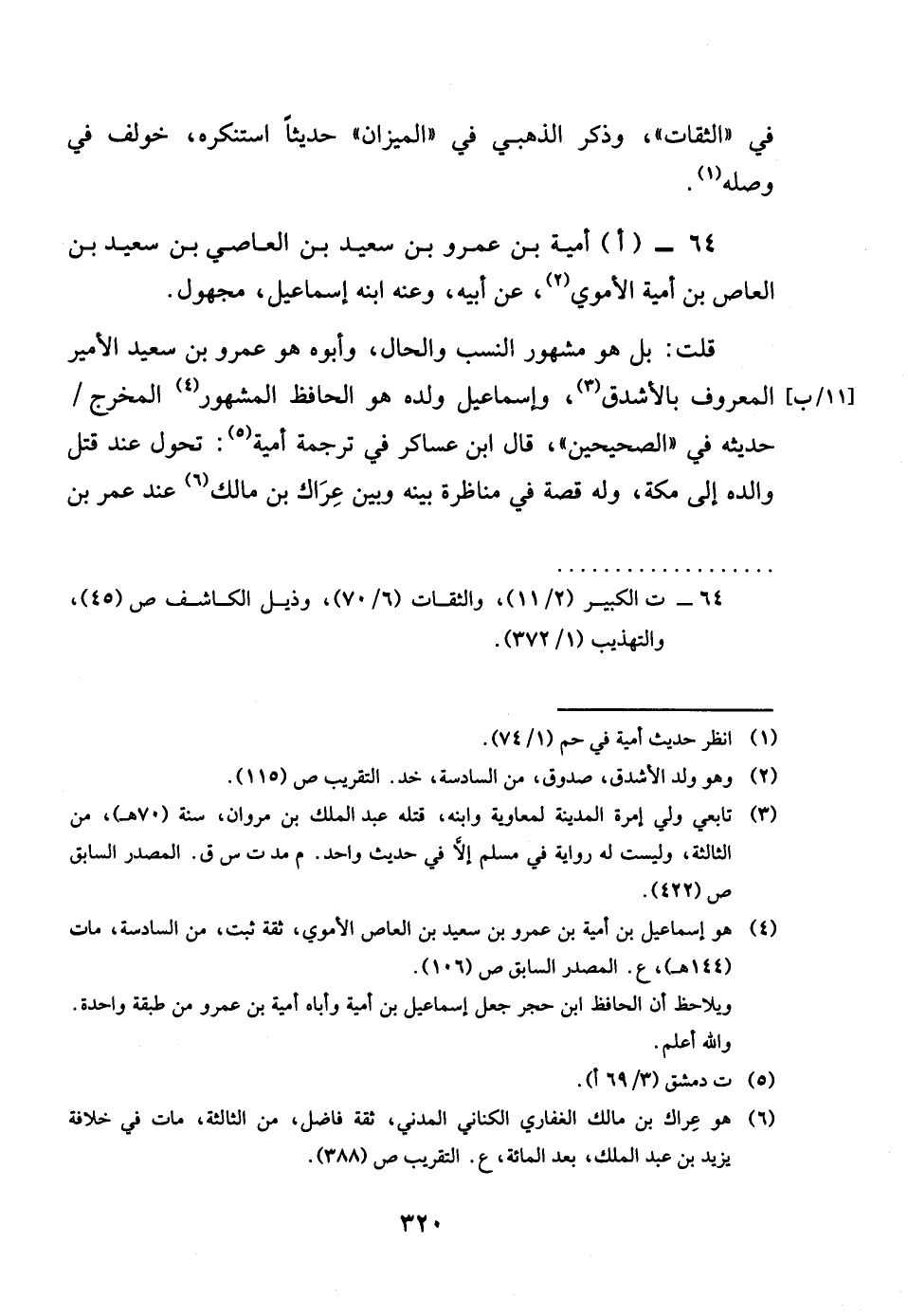64 - اأُميَّة بن عَمْرو بن سعيد بن الْعَاصِ بن سعيد بن الْعَاصِ بن أُميَّة الْأمَوِي عَن أَبِيه وَعنهُ ابْنه إِسْمَاعِيل مَجْهُول قلت بل هُوَ مَشْهُور النّسَب وَالْحَال وَأَبوهُ هُوَ عَمْرو بن سعيد الْأَمِير الْمَعْرُوف بالأشدق وَإِسْمَاعِيل وَلَده هُوَ الْحَافِظ الْمَشْهُور الْمخْرج حَدِيثه فِي الصَّحِيحَيْنِ قَالَ بن عَسَاكِر فِي تَرْجَمَة أُميَّة تحول عِنْد قتل وَالِده الى مَكَّة وَله قصَّة فِي مناظرة بَينه وَبَين عرَاك بن مَالك عِنْد عمر بن