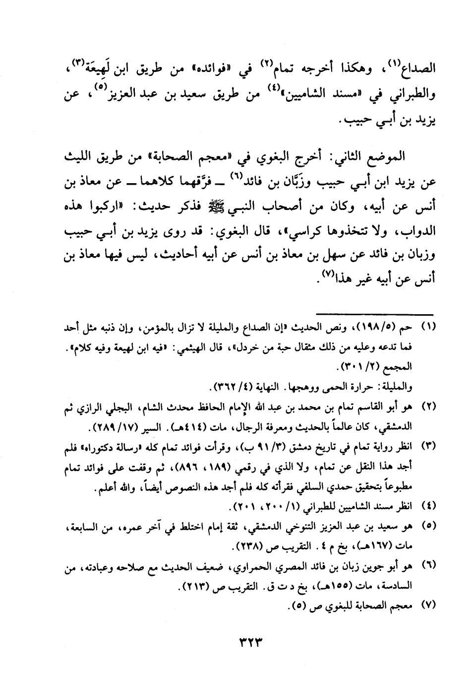 الصداع وَهَكَذَا أخرجه تَمام فِي فَوَائده من طَرِيق بن لَهِيعَة وَالطَّبَرَانِيّ فِي مُسْند الشاميين من طَرِيق سعيد بن عبد الْعَزِيز عَن يزِيد بن أبي حبيب الْموضع الثَّانِي اخْرُج الْبَغَوِيّ فِي مُعْجم الصَّحَابَة من طَرِيق اللَّيْث عَن يزِيد بن أبي حبيب وزبان بن فائد فرقهما كِلَاهُمَا جَمِيعًا عَن معَاذ بن أنس عَن أَبِيه وَكَانَ من أَصْحَاب النَّبِي صلى الله عَلَيْهِ وَسلم فَذكر حَدِيث اركبوا هَذِه الدَّوَابّ وَلَا تتخذوها كراسي قَالَ الْبَغَوِيّ قد روى يزِيد بن أبي حبيب وزبان بن فائد عَن سهل بن معَاذ بن أنس عَن أَبِيه أَحَادِيث لَيْسَ فِيهَا معَاذ بن أنس عَن أَبِيه غير هَذَا