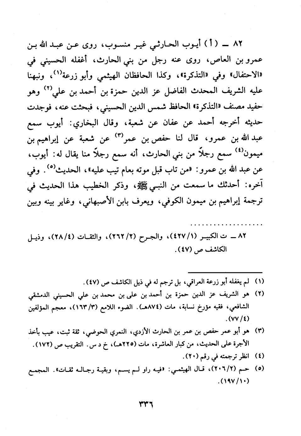 82 - اأَيُّوب الْحَارِثِيّ غير مَنْسُوب روى عَن عبد الله بن عَمْرو بن الْعَاصِ روى عَنهُ رجل من بنى الْحَارِث اغفله الْحُسَيْنِي فِي الاحتفال وَفِي التَّذْكِرَة وَكَذَا الحافظان الهيثمي وَأَبُو زرْعَة وَنَبَّهنَا عَلَيْهِ الشريف الْمُحدث الْفَاضِل عز الدّين حَمْزَة بن أَحْمد بن عَليّ وَهُوَ حفيد مُصَنف التَّذْكِرَة الْحَافِظ شمس الدّين الْحُسَيْنِي فبحثت عَنهُ فَوجدت حَدِيثه أخرجه أَحْمد عَن عَفَّان عَن شُعْبَة وَقَالَ البُخَارِيّ أَيُّوب سمع عبد الله بن عَمْرو قَالَ لنا حَفْص بن عمر عَن شُعْبَة عَن إِبْرَاهِيم بن مَيْمُون سمع رجلا من بنى الْحَارِث أَنه سمع رجلا منا يُقَال لَهُ أَيُّوب عَن عبد الله بن عَمْرو من تَابَ قبل مَوته بعأم تيب عَلَيْهِ الحَدِيث وَفِي آخِره أحَدثك مَا سَمِعت من النَّبِي صلى الله عَلَيْهِ وَسلم وَقَالَ بن حبَان فِي الثِّقَات بعد أَن ذكره فِي ثِقَات التَّابِعين وعرفه بِمَا فِي هَذَا السَّنَد أَحْسبهُ أَيُّوب بن فرقد قلت وَلم ار لأيوب بن فرقد عِنْده ذكرا وَلَا عِنْد غَيره وَذكر الْخَطِيب هَذَا الحَدِيث فِي تَرْجَمَة إِبْرَاهِيم بن مَيْمُون الْكُوفِي وَيعرف بِابْن الْأَصْبَهَانِيّ وغاير بَينه وَبَين