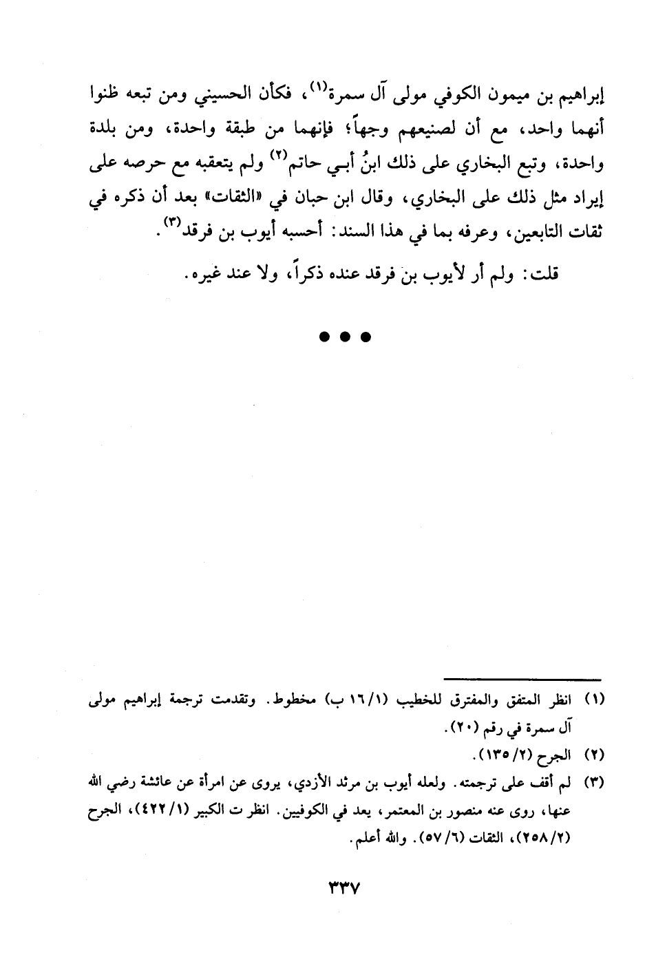 إِبْرَاهِيم بن مَيْمُون الْكُوفِي مولى آل سَمُرَة فَكَانَ الْحُسَيْنِي وَمن تبعه ظنُّوا انهما وَاحِد مَعَ ان لصنيعهم وَجها فَإِنَّهُمَا من طبقَة وَاحِدَة وَمن بَلْدَة وَاحِدَة وَتبع البُخَارِيّ على ذَلِك بن أبي حَاتِم وَلم يتعقبه مَعَ حرصه على إِيرَاد مثل ذَلِك على البُخَارِيّ وقَالَ ابْن حبَان فِي الثِّقَات بعد أَن ذكره فِي ثِقَات التَّابِعين وعَرَفَة بِمَا فِي هَذَا السَّنَد أحسبة أَيُّوب بن فرقد