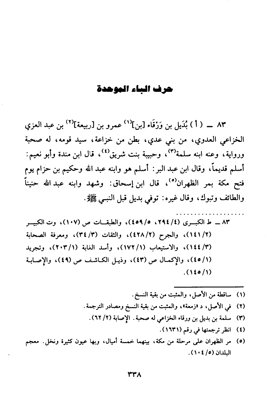 83 - ابديل بن وَرْقَاء بن عَمْرو بن ربيعَة بن عبد الْعُزَّى الْخُزَاعِيّ الْعَدوي من بنى عدي بطن من خُزَاعَة سيد قومه لَهُ صُحْبَة وَرِوَايَة وَعنهُ ابْنه سَلمَة وحبيبة بنت شريق قَالَ بن مندة وَأَبُو نعيم اسْلَمْ قَدِيما وَقَالَ بن عبد الْبر اسْلَمْ هُوَ وَابْنه عبد الله وَحَكِيم بن حزَام يَوْم فتح مَكَّة بمر الظهْرَان قَالَ بن إِسْحَاق وَشهد وَابْنه عبد الله حنينا والطائف وتبوك وَقَالَ غَيره توفّي بديل قبل النَّبِي صلى الله عَلَيْهِ وَسلم