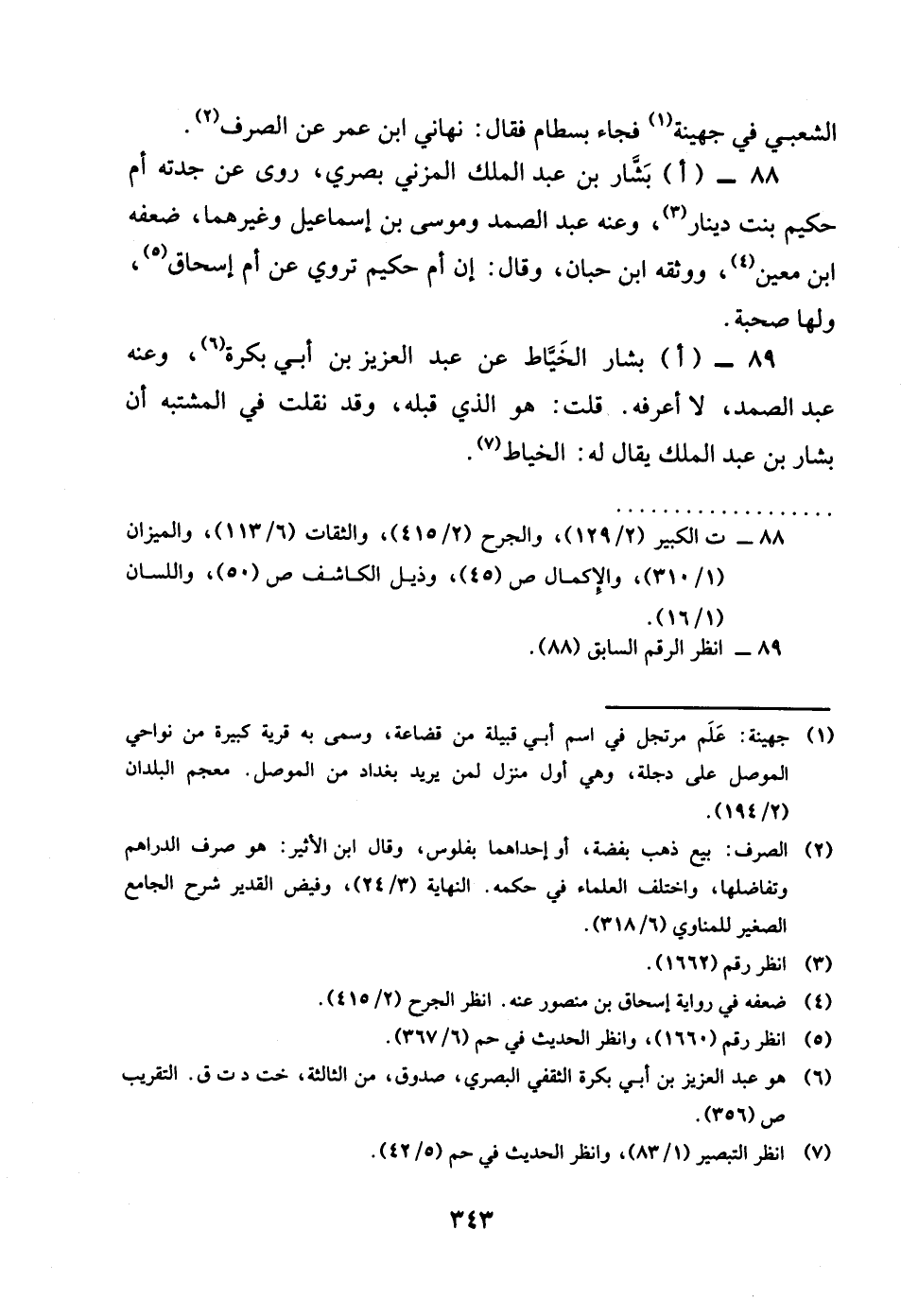 89 - ابشار الْخياط عَن عبد الْعَزِيز بن أبي بكرَة وَعنهُ عبد الصَّمد لَا اعرفه قلت هُوَ الَّذِي قبله وَقد نقلت فِي المشتبه ان بشار بن عبد الْملك يُقَال لَهُ الْخياط