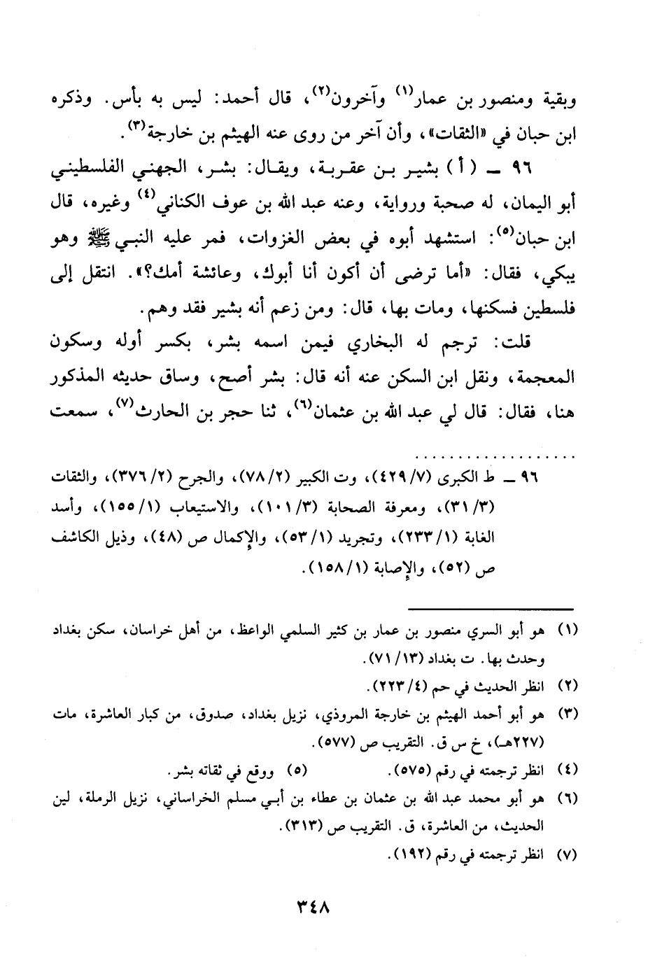 96 - ابشير بن عقربة وَيُقَال بشر الْجُهَنِيّ الفلسطيني أَبُو الْيَمَان لَهُ صُحْبَة وَرِوَايَة وَعنهُ عبد الله بن عَوْف الْكِنَانِي وَغَيره قَالَ بن حبَان اسْتشْهد أَبوهُ فِي بعض الْغَزَوَات فَمر عَلَيْهِ النَّبِي صلى الله عَلَيْهِ وَسلم وَهُوَ يبكي فَقَالَ أما ترْضى ان اكون انا أَبوك وَعَائِشَة أمك انْتقل الى فلسطين فسكنها وَمَات بهَا قَالَ وَمن زعم انه بشير فقد وهم قلت ترْجم لَهُ البُخَارِيّ فِيمَن اسْمه بشر بِكَسْر أَوله وَسُكُون الْمُعْجَمَة وَنقل بن السكن عَنهُ انه قَالَ بشر أصح وسَاق حَدِيثه الْمَذْكُور هُنَا فَقَالَ قَالَ لي عبد الله بن عُثْمَان ثَنَا حجر بن الْحَارِث سَمِعت